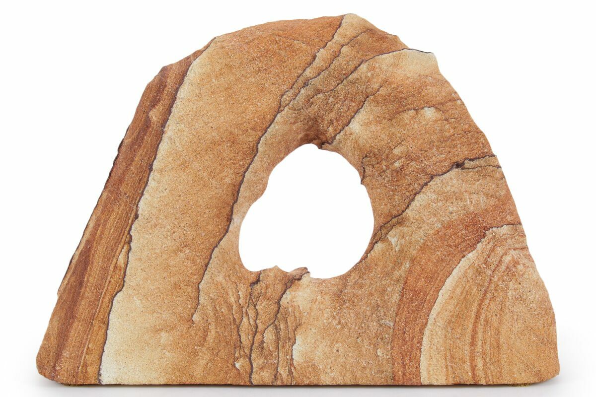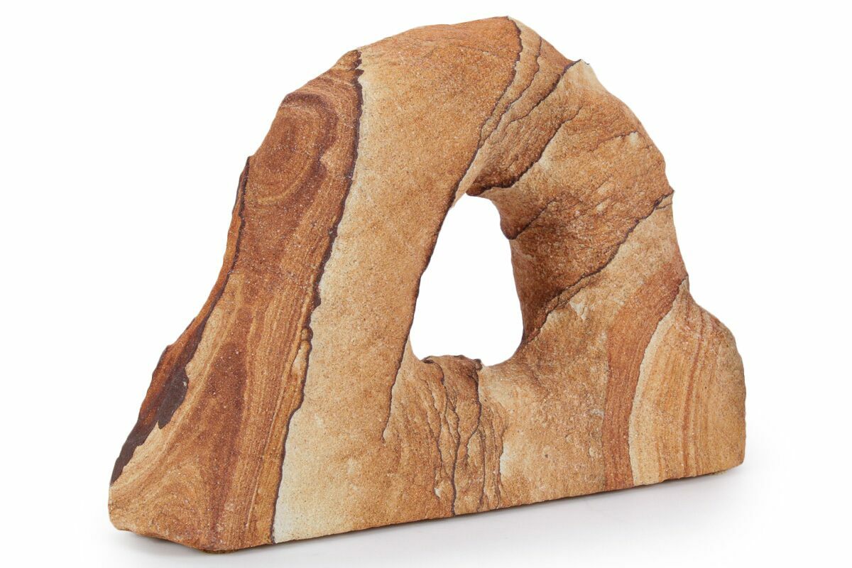 This is a 6.9" wide Toroweap picture sandstone arch. This stunning and distinctive sandstone, mined near Snowflake, Arizona, has been artistically crafted into an arch shape, inspired by natural sandstone formations like Delicate Arch in Arches National Park. The base of this specimen has been cut flat for vertical presentation.