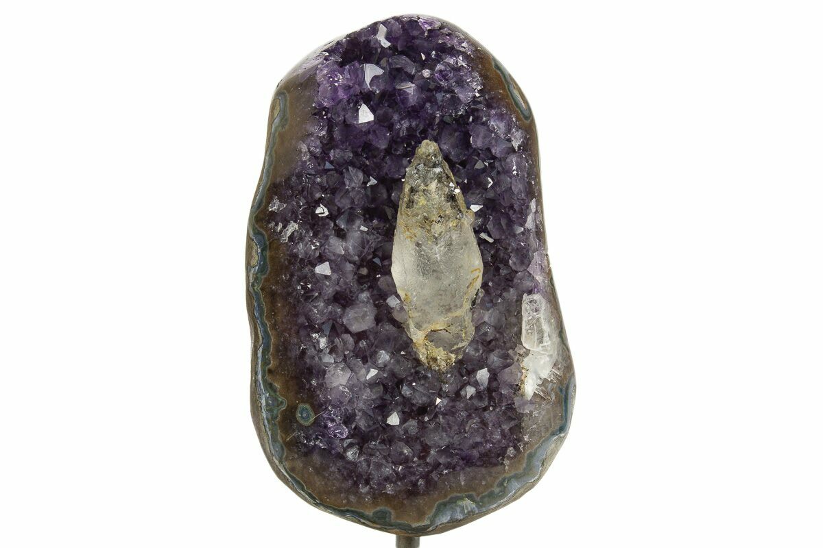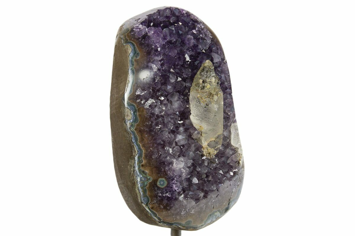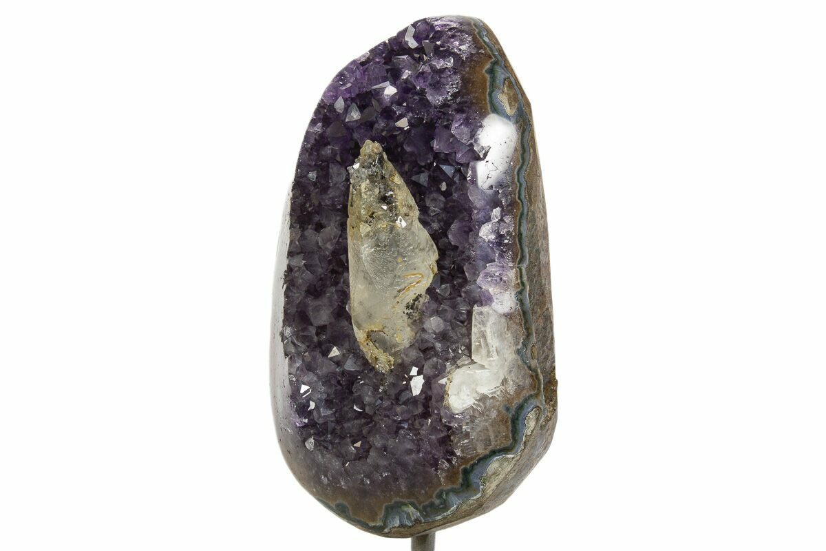 This is a gorgeous, dark amethyst crystal geode that has been mounted to a metal stand. The cluster itself is 6" tall by 3.75" wide. Including the stand, the specimen is 8.2" tall. The outer edge of the geode has been polished, allowing for display of the various crystal growth layers. There is a well-formed calcite crystal at the center of this specimen.