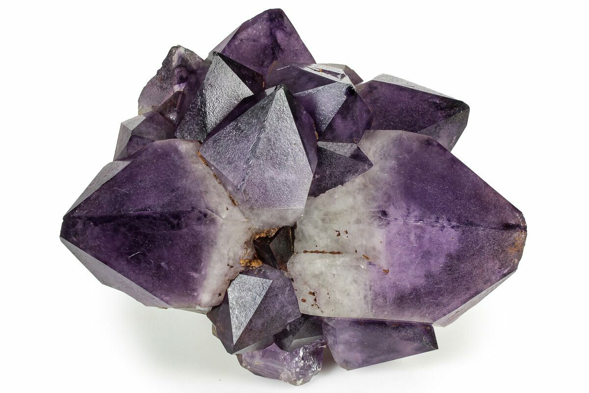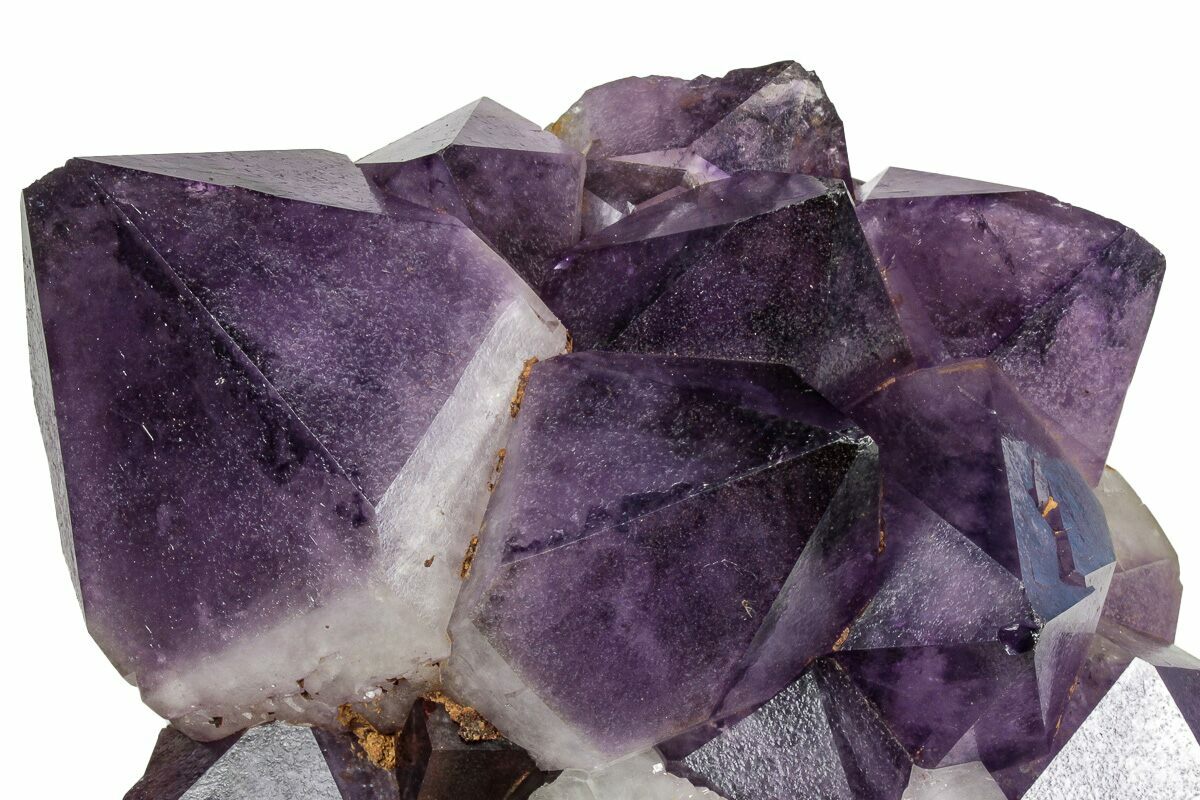 This is a stunning, 6" wide amethyst crystal cluster with beautiful purple coloration and exceptional luster, collected from the Democratic Republic of the Congo. These crystals have undergone no color treatment or polishing. The orange-red color across some of the crystals can be attributed to iron oxidation. There is glue stabilization at the base of the crystals. There is damage to a couple of the points on the crystals in this cluster.