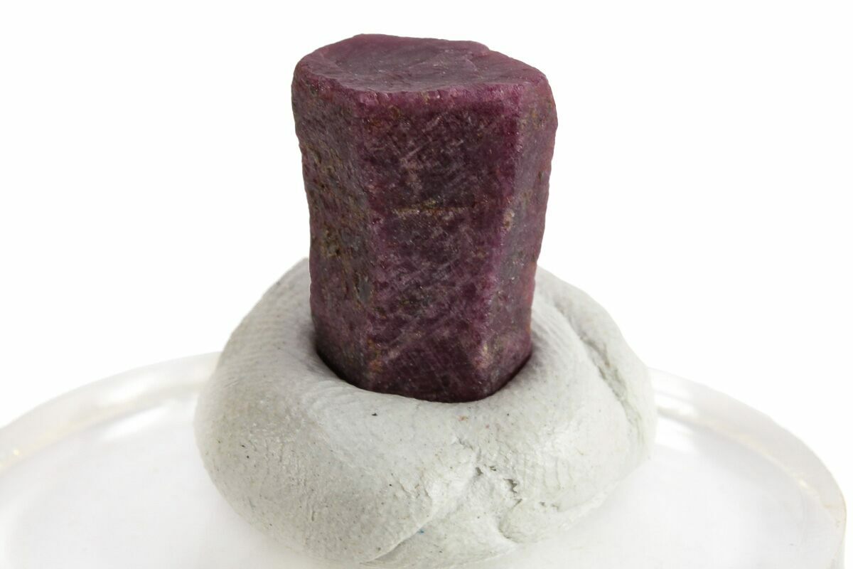 This is a beautiful, .6" wide "floater" crystal of ruby from the Mysore District of Kamataka, India. These rubies form naturally within a hard matrix from which they have been completely removed. It bears a deep magenta coloration and is opaque. Under shortwave UV light, the crystal exhibits a vibrant red-pink fluorescence.