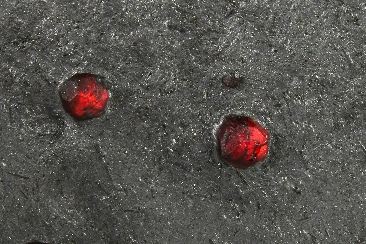The Red Embers Garnet Mine (previously known as the Two Fat Guys Mine) is located in Erving, Massachusetts. This mine is known for producing vibrant red, translucent almandine garnets in a graphite matrix. Mining of these specimens began over 20 years ago and to this day is still ongoing. The vein from which these specimens are extracted is composed primarily of graphite that ranges in size from 1 to 6 feet wide in some spots. The garnets are scattered throughout this graphite matrix along with black dravite tourmaline crystals.