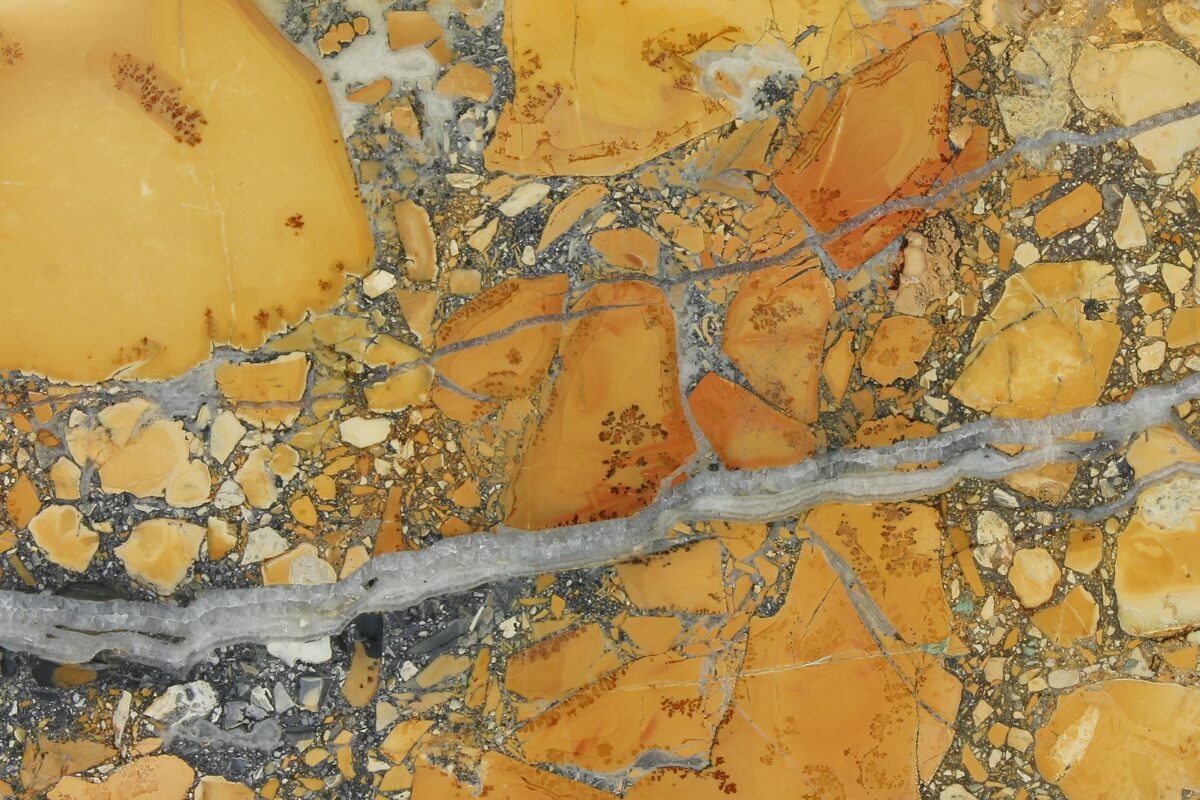 This is a Maligano jasper slab that has been cut and polished to a glossy finish. Maligano jasper is the trade name for a brecciated yellow, orange, red, grey, and blue-grey jasper found in Indonesia. Most of these specimens contain rivers of agate filling the gaps between the brecciated jasper. These specimens also often contain dendritic inclusions throughout.
