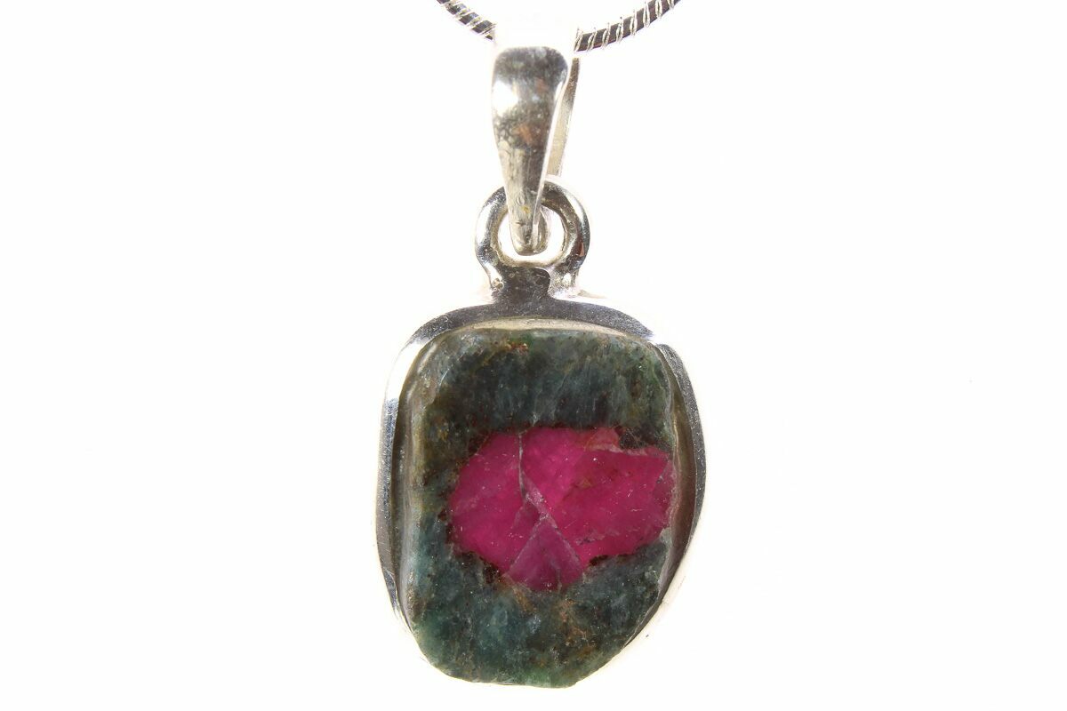 This is a gorgeous pendant made from a natural stone of ruby in kyanite, quartz, and fuchsite, collected from India. It has been shaped and polished to a glossy finish, and measures .6" tall (including loop). The stone has been set into 925 sterling silver and is accompanied by a 24" long, silver plated snake chain necklace with a lobster clasp. You will receive the exact pendant pictured.
