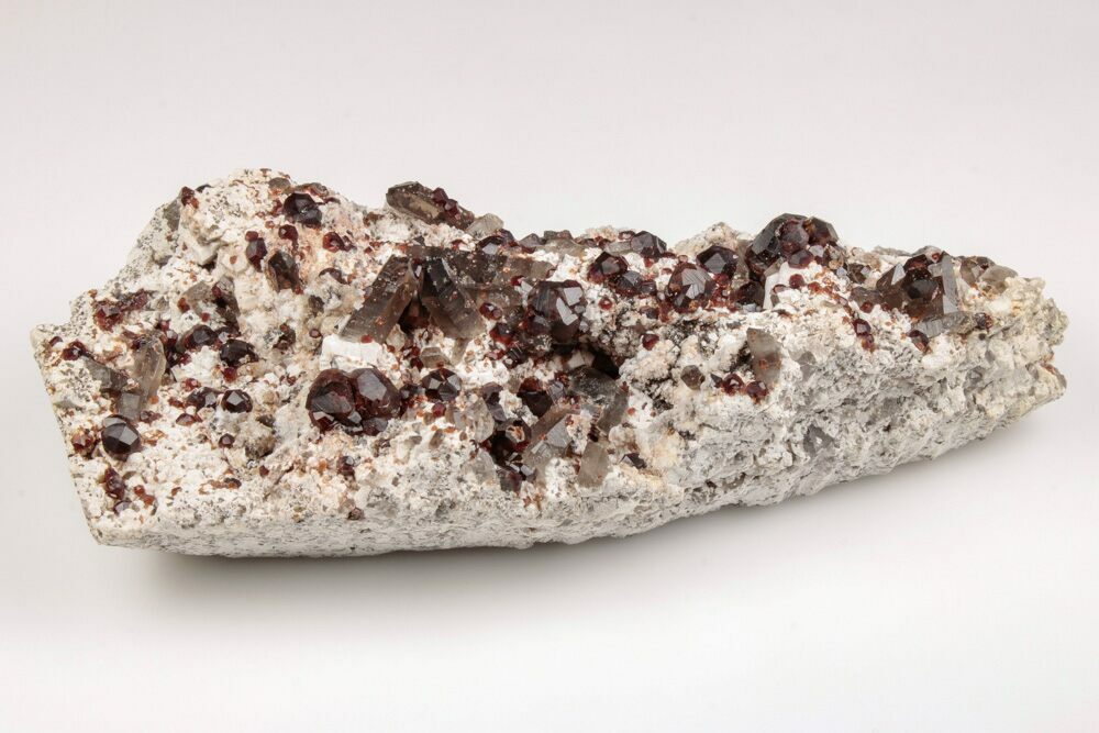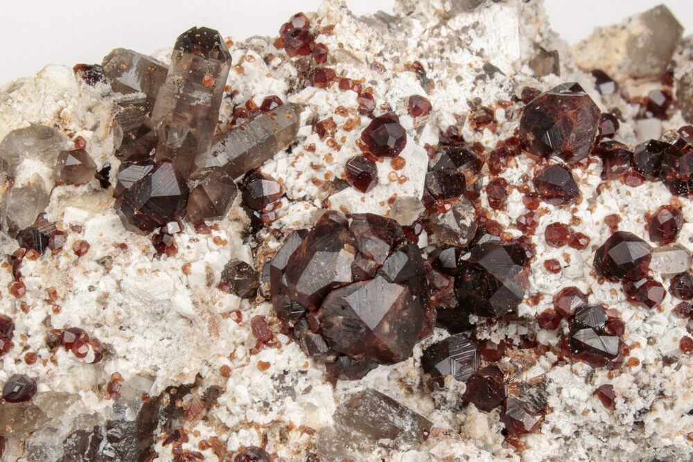 Here is a beautiful, 6" wide association of spessartine garnets and smoky quartz on microcline feldspar, collected from the Wushan Spessartine Mine in Fujian, China.