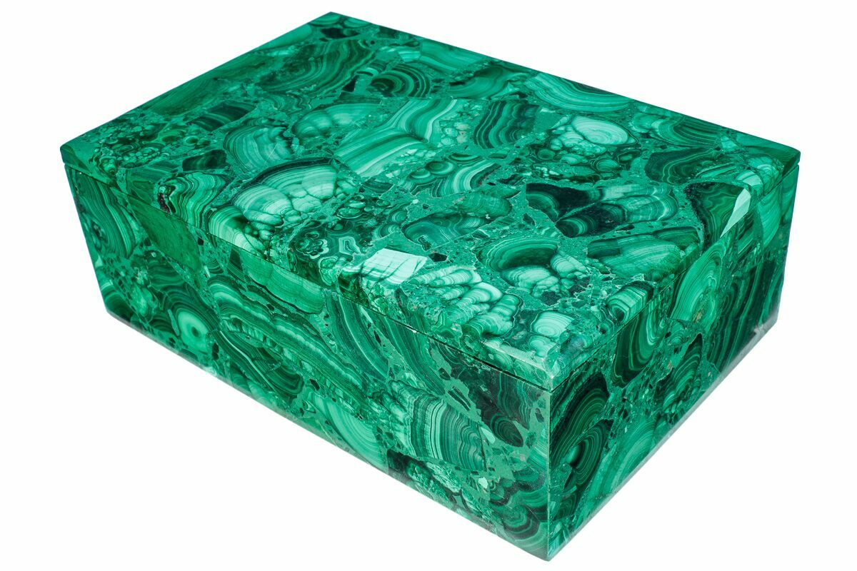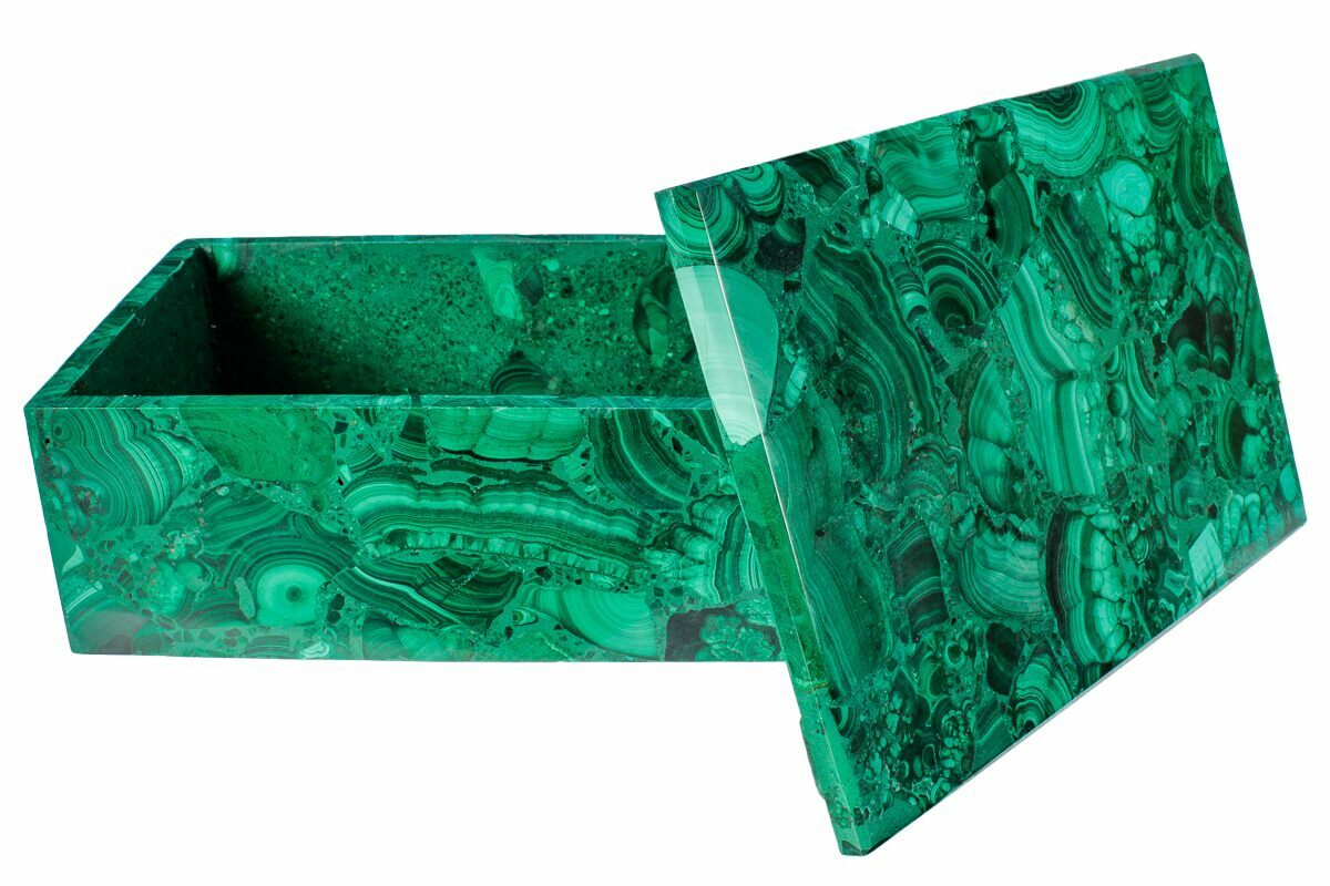 This is an absolutely gorgeous jewelry box with a removable lid, made from composited slabs of polished silky malachite from the Democratic Republic of the Congo, Africa. The dimensions of this jewelry box are 6 x 3.8 x 2.3".
