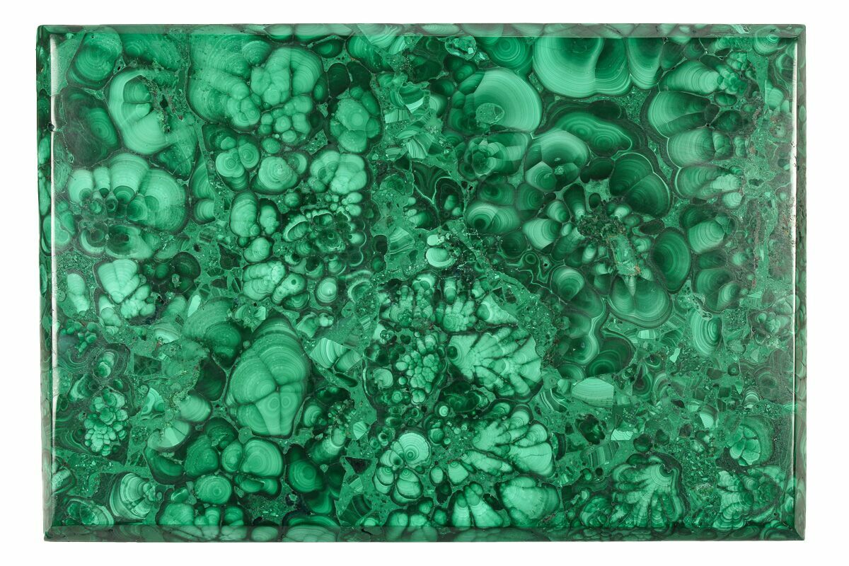 Malachite is an intense green copper-based mineral that can be found in a wide variety of forms. Malachite can grow in botryoidal masses, stalactitic formations, and reniform formations, typically as a tight cluster of fanning fibrous needles that make up a seemingly solid mass. As layers continue to stack during formation, banded patterns can sometimes begin to take shape, explaining the rings in all shades of green seen on most polished malachite specimens.