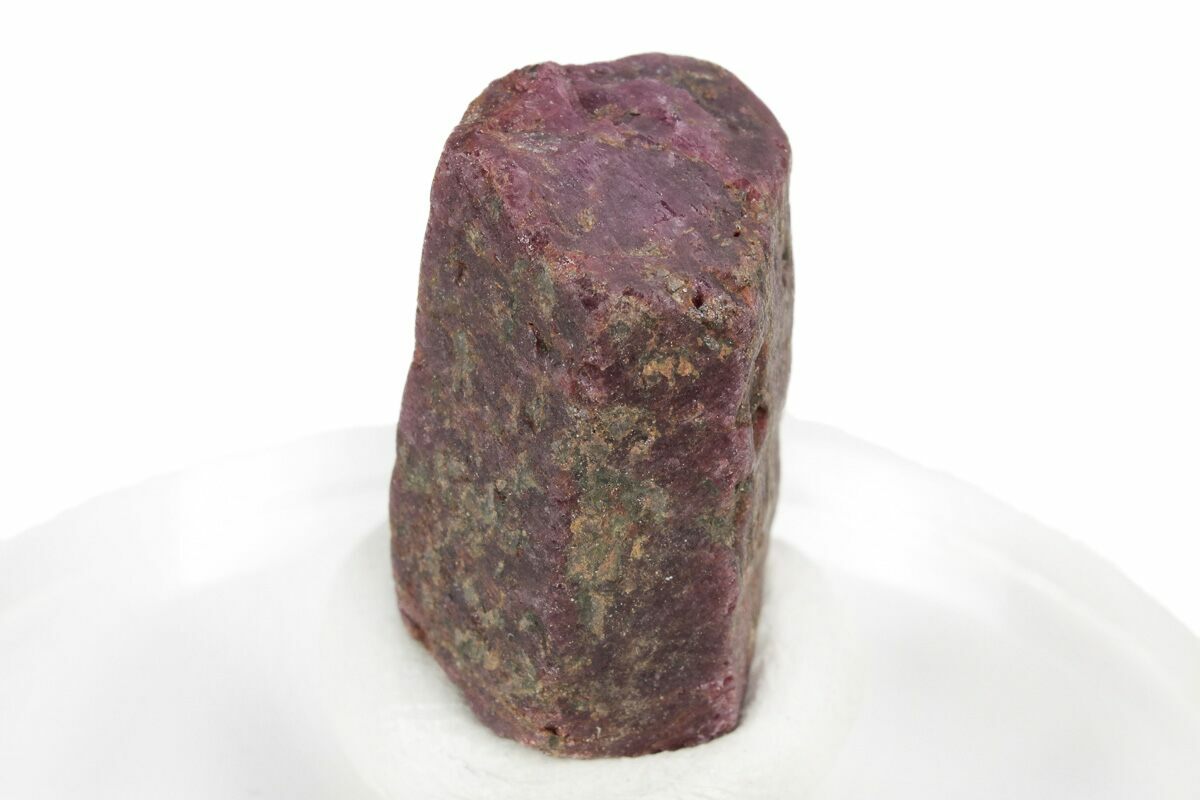 This is a beautiful, .65" wide "floater" crystal of ruby from the Mysore District of Kamataka, India. These rubies form naturally within a hard matrix from which they have been completely removed. It bears a deep magenta coloration and is opaque. Under shortwave UV light, the crystal exhibits a vibrant red-pink fluorescence.