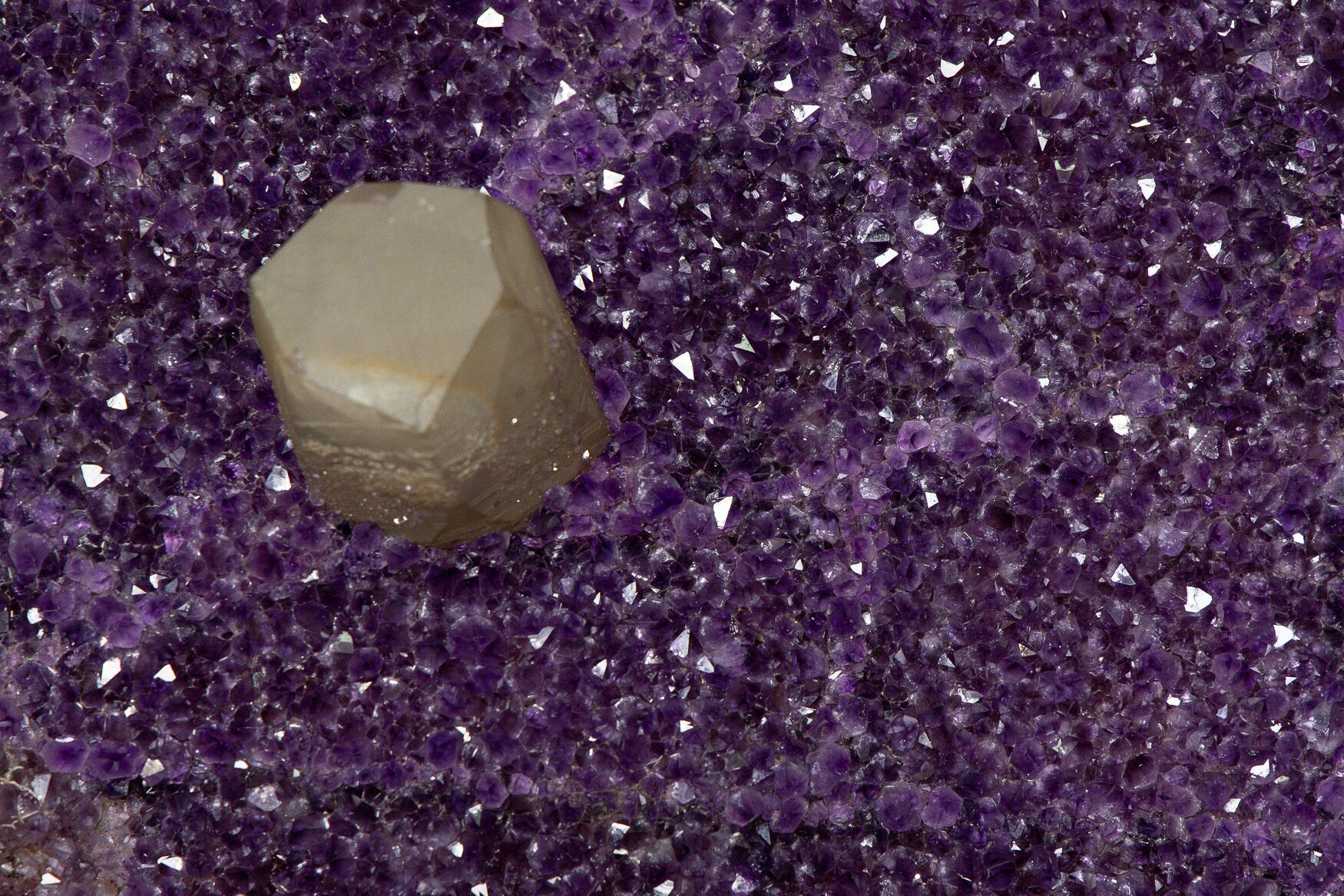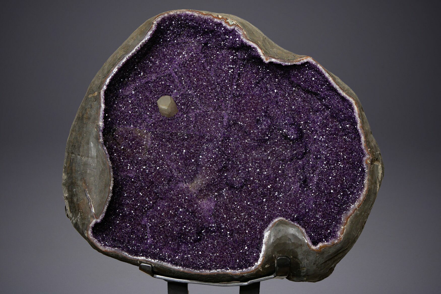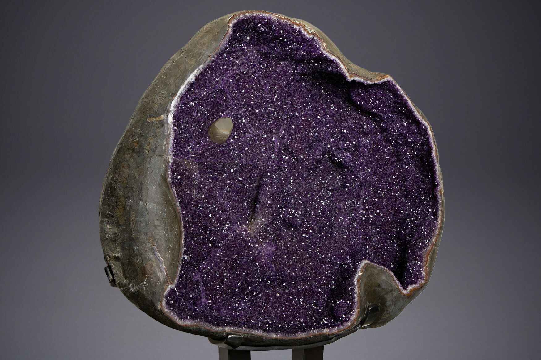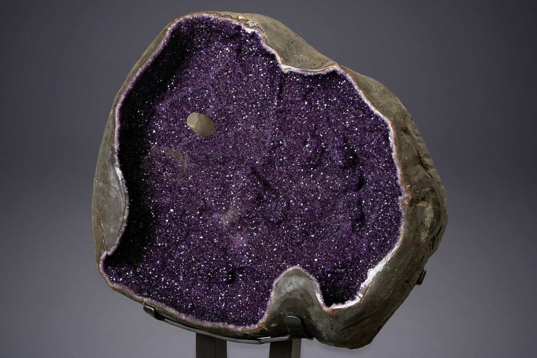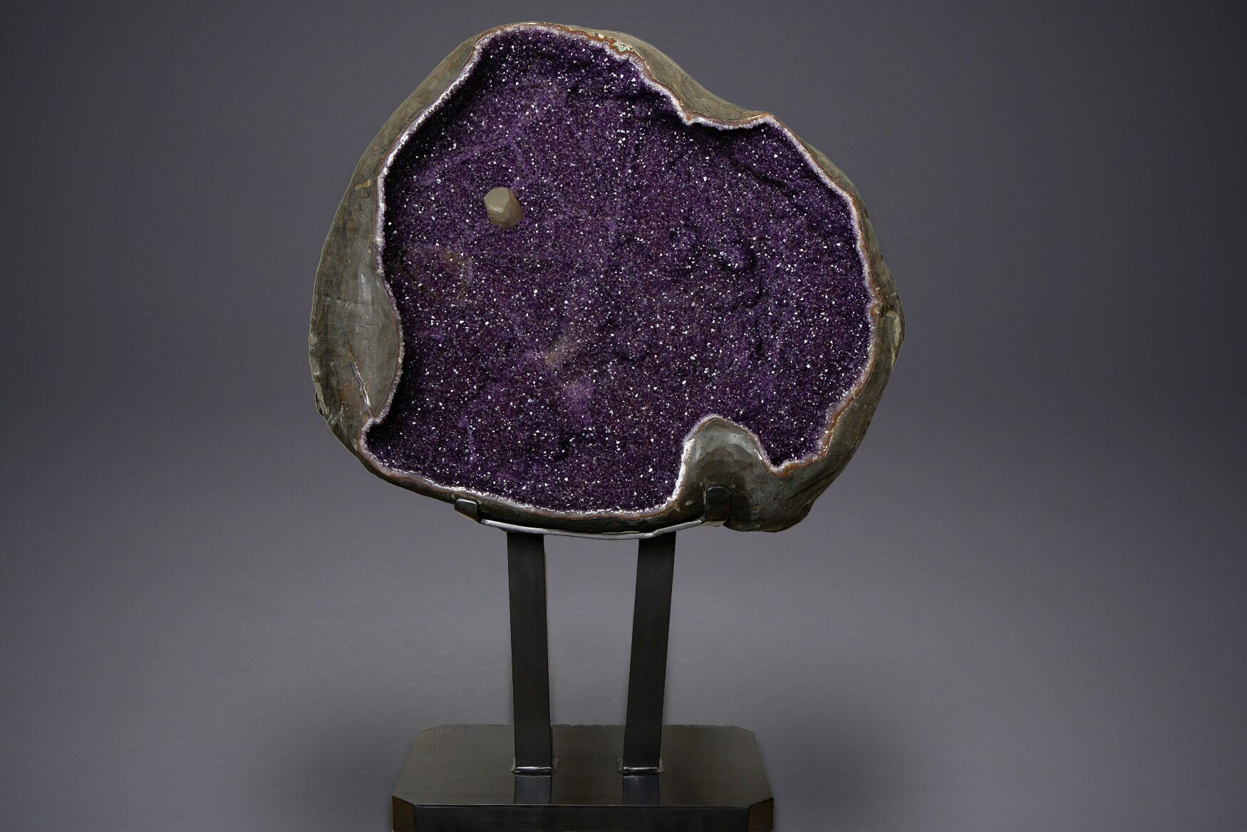 Nestled within the amethyst is a single prominent calcite crystal that serves as a striking focal point. Its contrasting form and lighter tone stand out dramatically against the surrounding purple druse. Mounted securely on a sturdy custom metal display stand, the piece commands attention at a full 66" tall including the base, making it a powerful natural centerpiece suited for grand interiors or gallery settings.