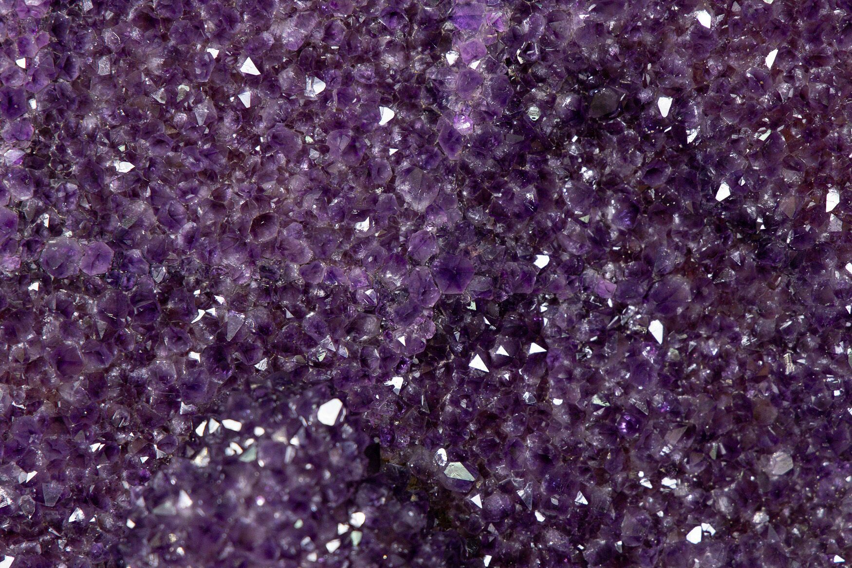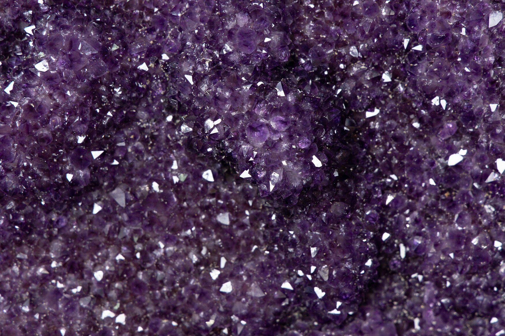 This massive 49.5" wide amethyst geode is an extraordinary display piece, showcasing a sweeping interior lined with amethyst crystals in excellent condition. The open face of the geode is beautifully cut and positioned so that none of the crystal-lined cavity is concealed, allowing natural and ambient light to reach deep inside and illuminate every shimmering point. The crystals display rich purple coloration and sharp, well-preserved terminations, creating a vibrant, sparkling surface across the entire interior. The rind of the geode has been polished, creating a smooth, refined border that beautifully frames the crystal-lined interior.