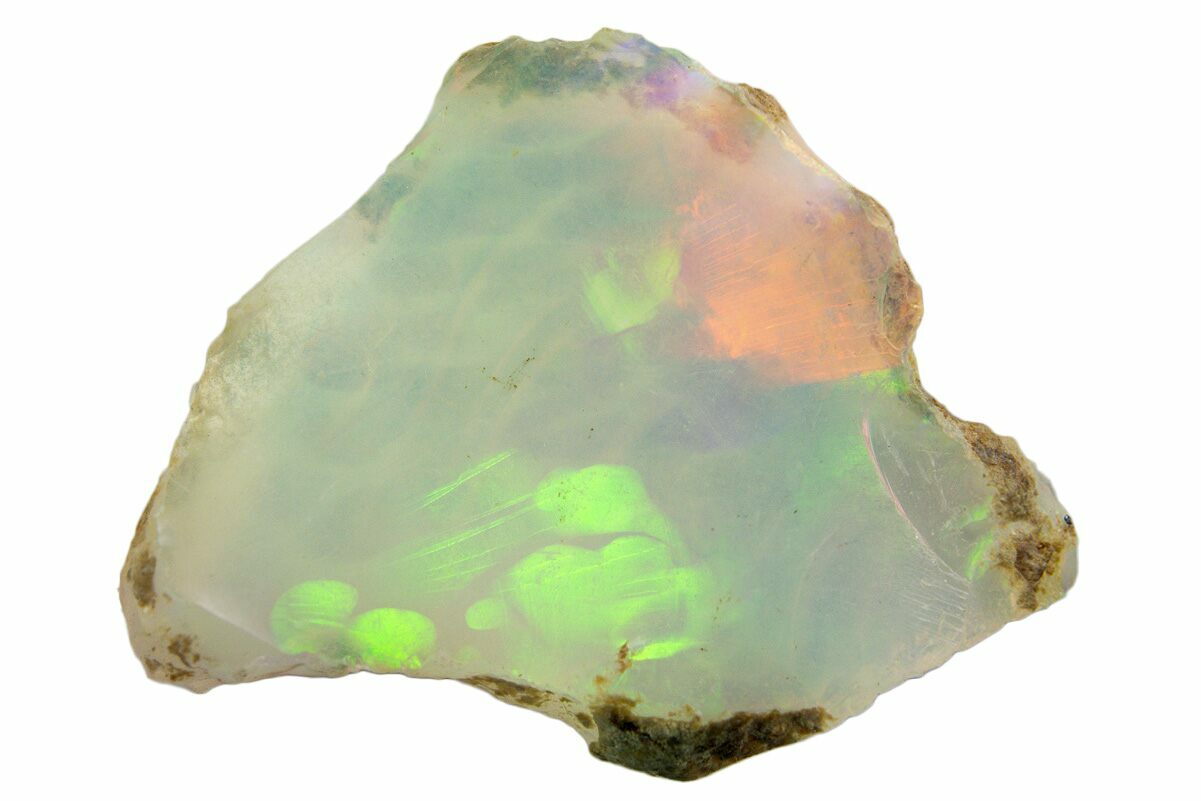 This is a rough Ethiopian fire opal that exhibits top quality color flash. It measures .68" wide and weighs .53 grams (2.6 carats). It still has some of the matrix attached which could be cleaned/polished away. It is untreated and stable, having been slowly dried for several months since it was mined.