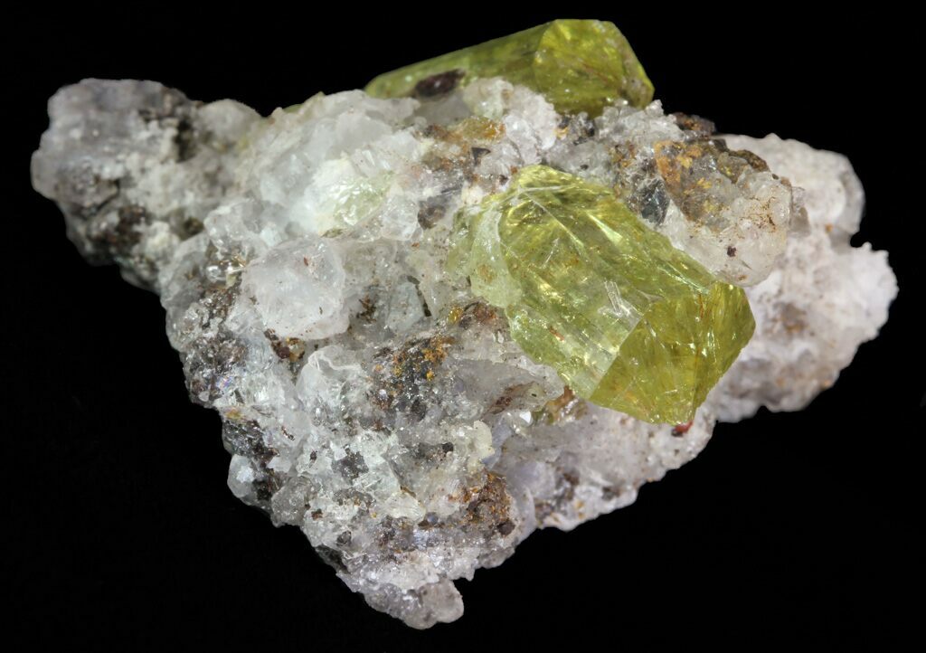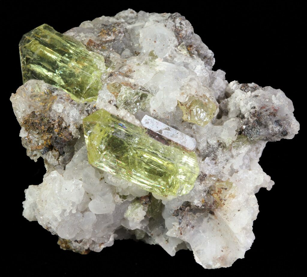This is a lustrous, lemon yellow, apatite crystal still in matrix from Cerro del Mercado (Iron Mountain) at Durango, Mexico. Two beautiful, transparent crystals can be found exposed on what could be considered the top of the specimen. The metallic mineralization on this specimen is magnetite, with the quartz acting as the matrix for both the apatite and magnetite.