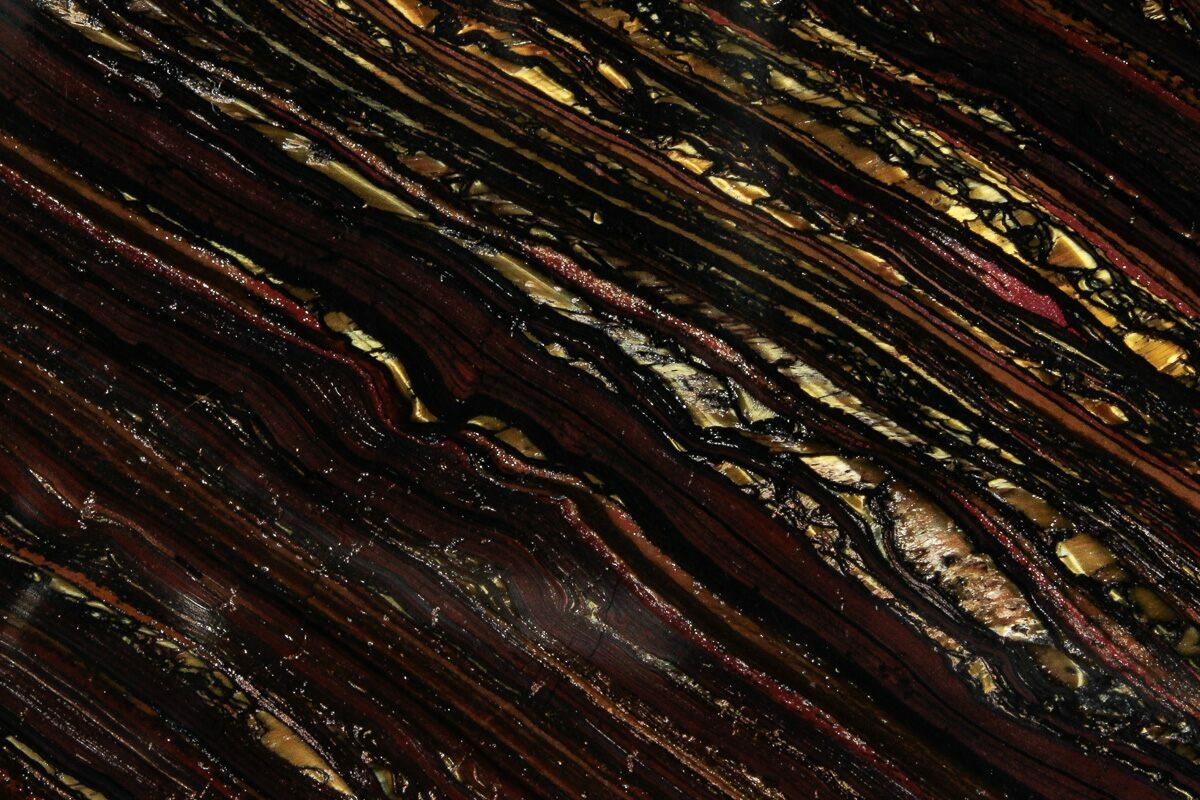 Tiger Iron is composed mainly of tiger's eye, red jasper, and black hematite in an undulating banded pattern. It is mined primarily in two large deposits, one in South Africa and the other in Western Australia. Both deposits are over 2 billion years old!