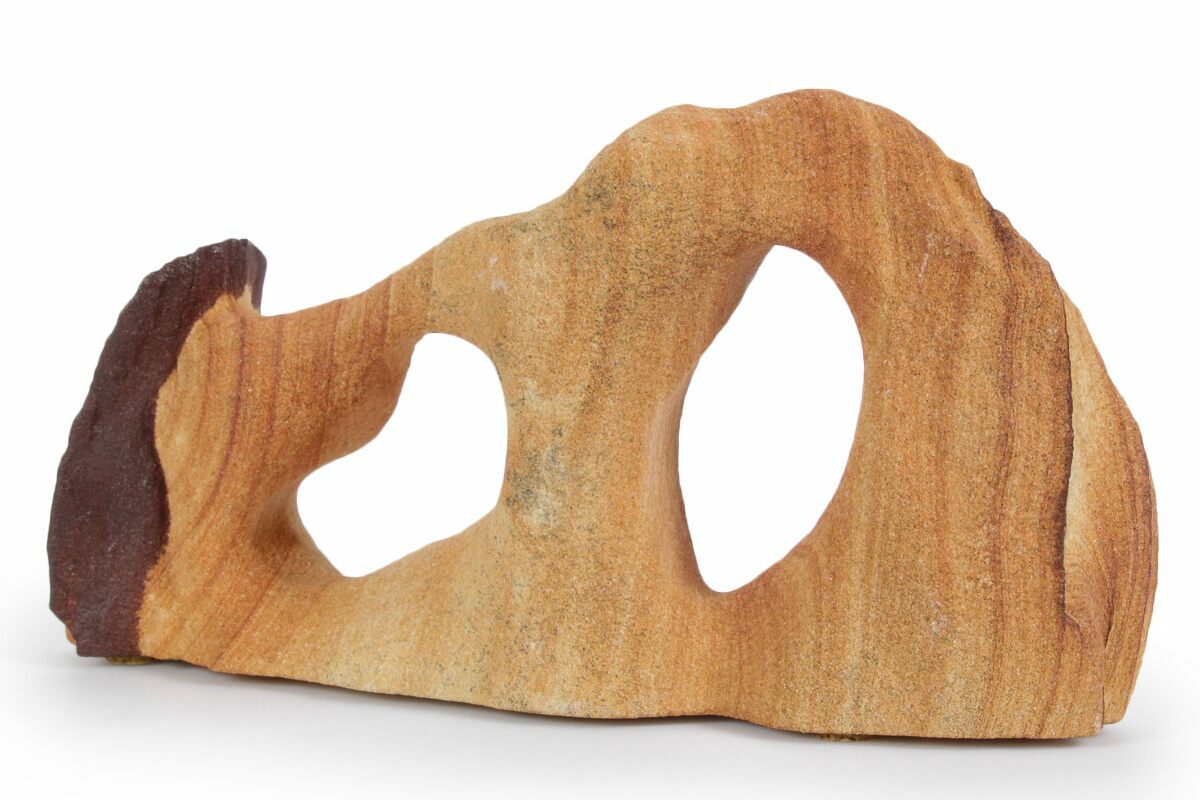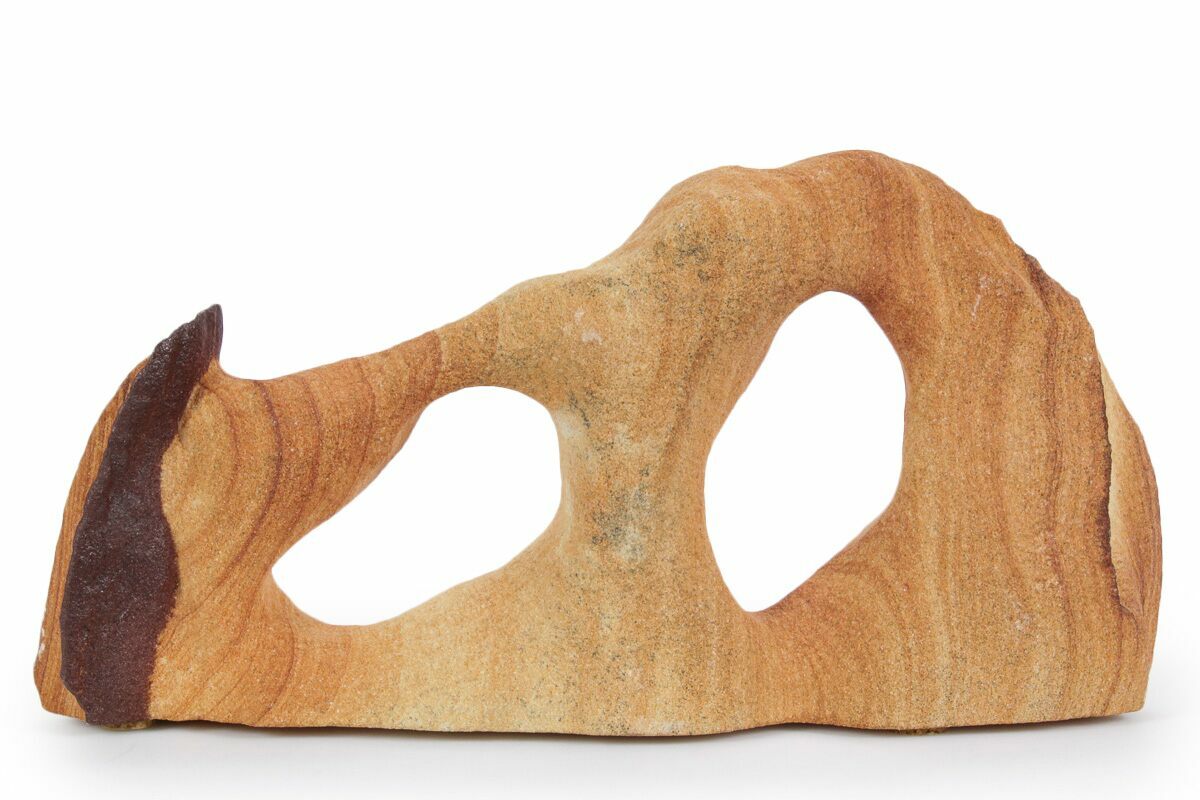 This is a 7.05" wide Toroweap picture sandstone arch. This stunning and distinctive sandstone, mined near Snowflake, Arizona, has been artistically crafted into an arch shape, inspired by natural sandstone formations like Delicate Arch in Arches National Park. The base of this specimen has been cut flat for vertical presentation.