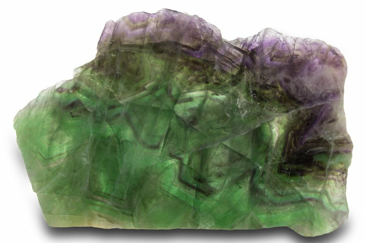 This is a beautiful slab of polished green and purple fluorite mined in China. Both sides have been polished to a glossy finish, really showing off its interior chevron patterns. The specimen has been backlit in the photos to better show the colors.