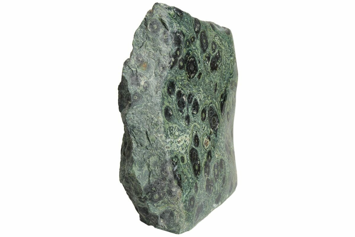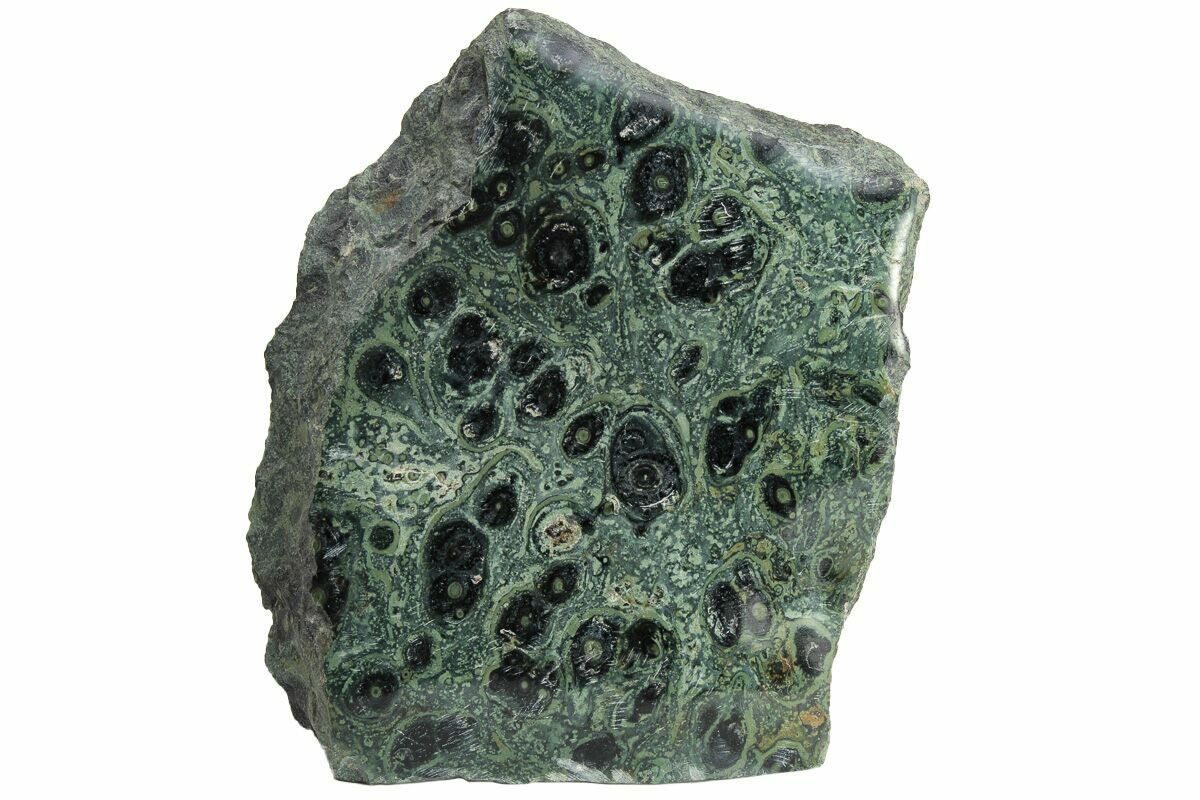 This is a beautiful Kambaba Jasper specimen with one face polished, that was collected from Madagascar. It is 7.1" wide and has dark circular mineral formations throughout the jasper. The base has been cut flat so that it displays nicely on a hard surface and would be suitable as either an indoor or outdoor decorative piece.