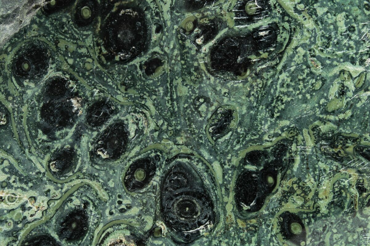 Kambaba jasper—also known in the trade as “crocodile jasper”—is a striking, green-and-black ornamental stone originating from the west-central Bongolava region of Madagascar. Despite the name, it isn’t a true jasper at all, but a rhyolitic volcanic rock that formed from ancient silica-rich lava flows. Its signature appearance comes from swirling green groundmass punctuated by dark, orbicular structures composed of fine amphibole needle aggregates. These orbs can resemble reptilian or amphibian eyes, which is how the nickname “crocodile jasper” arose.