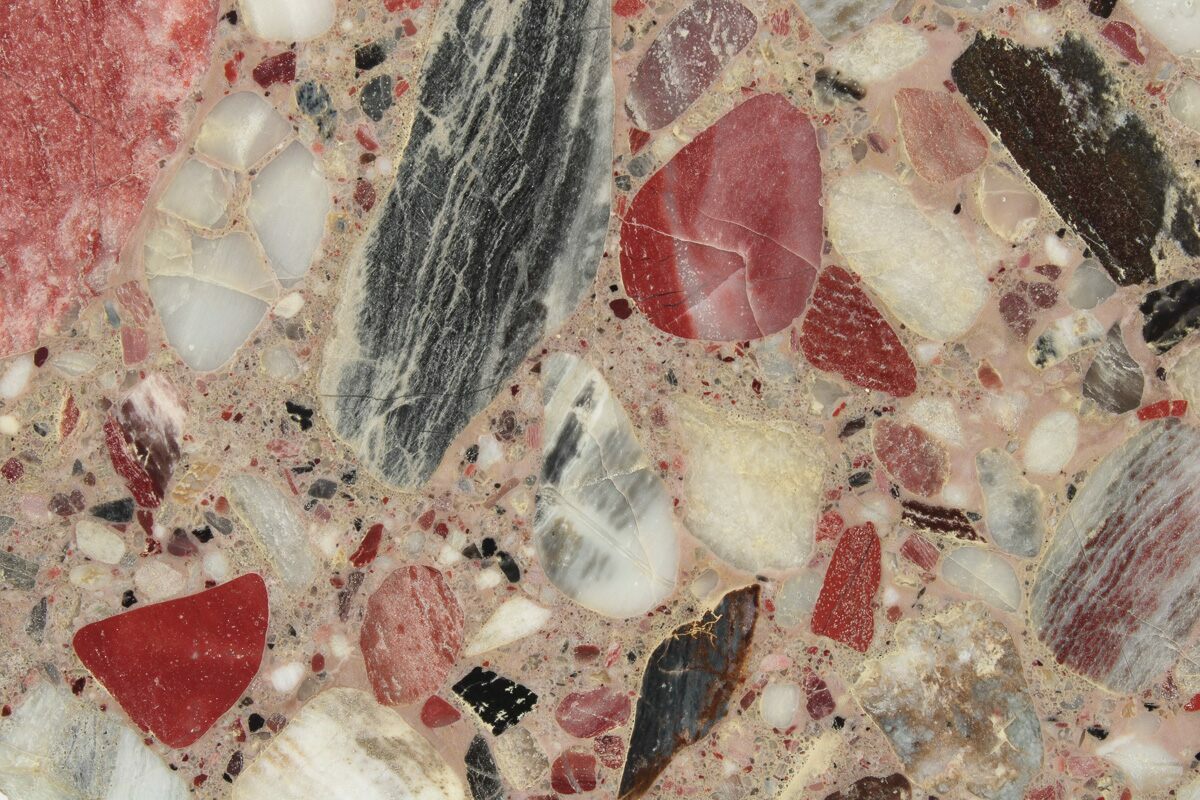This is a 7.2" polished brecciated chert slab from the Pinyalling Hills in the midwest region of Western Australia. Chert breccia consists of innumerable angular fragments of assorted rock types. The dominant rock types associated in the mix are agate, jasper, chert, and hematite, and originates from a type of jasper that goes by the trade name Pinyalling jasper.