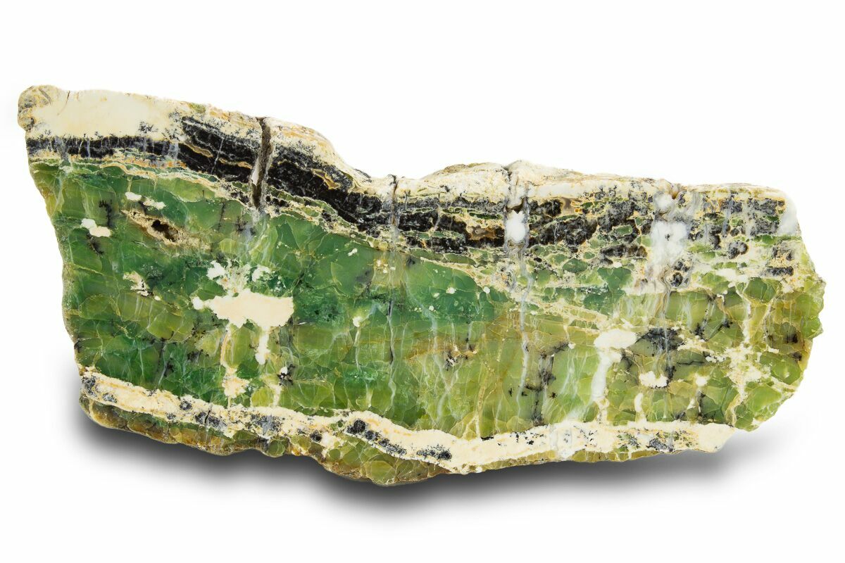 This is a cut and polished slab of common green opal with small, black dendritic inclusions. This form of common opal comes from a location south of Kalgoorlie in the Eastern Goldfields of Western Australia. The beautiful green coloration is caused by traces of nickel and/or chromium within the mineralization.