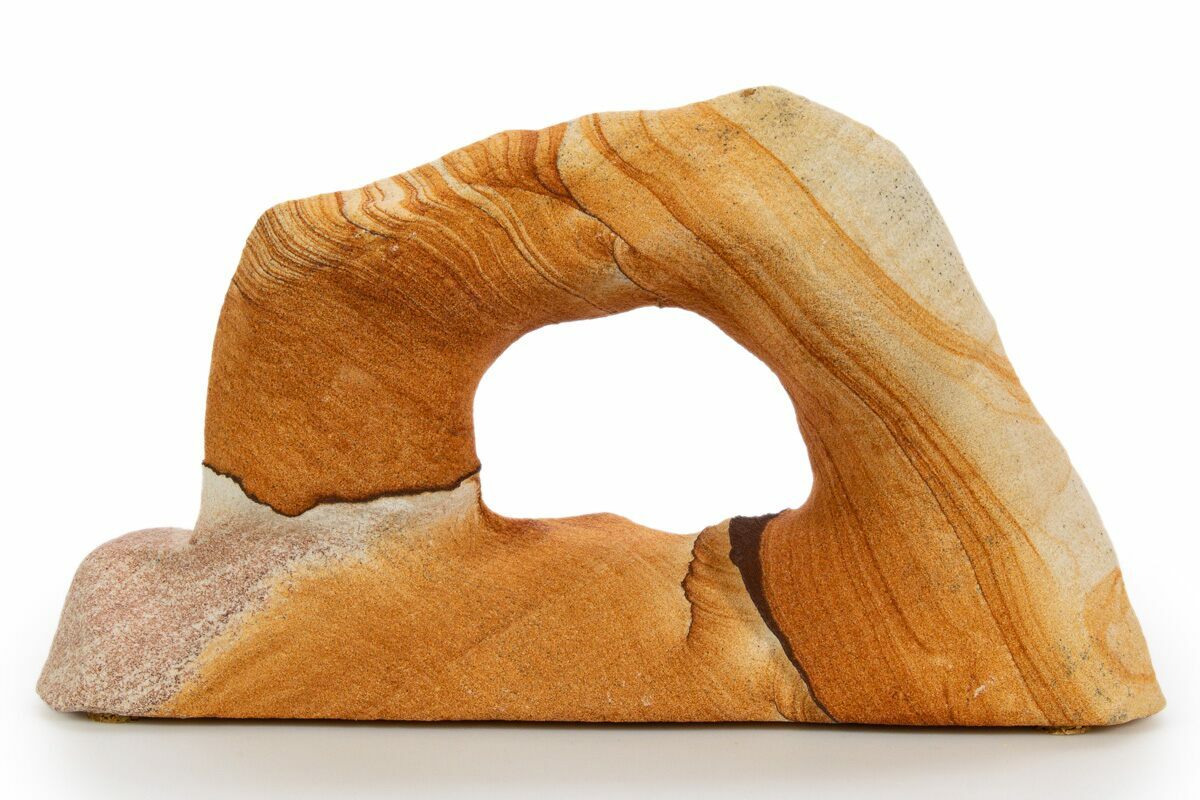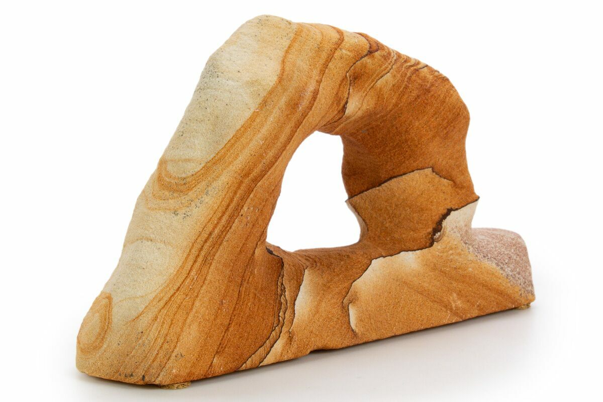 This is a 7.25" wide Toroweap picture sandstone arch. This stunning and distinctive sandstone, mined near Snowflake, Arizona, has been artistically crafted into an arch shape, inspired by natural sandstone formations like Delicate Arch in Arches National Park. The base of this specimen has been cut flat for vertical presentation.