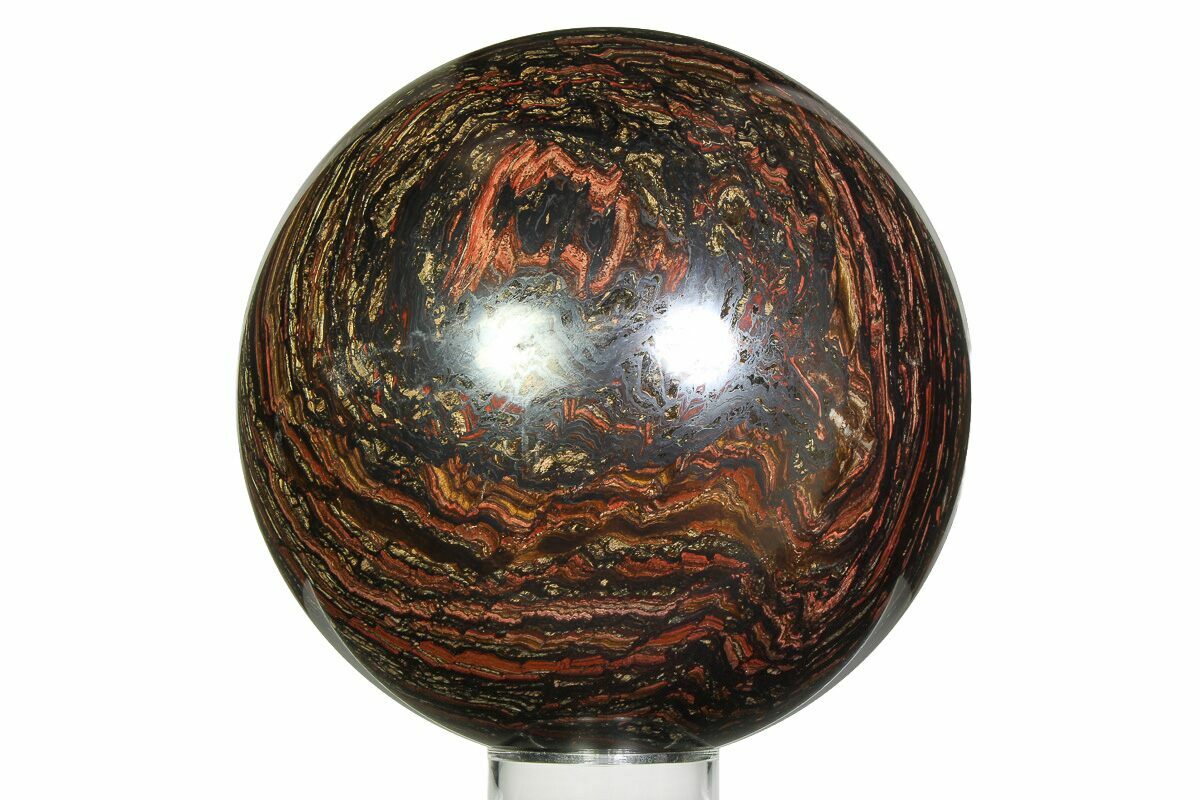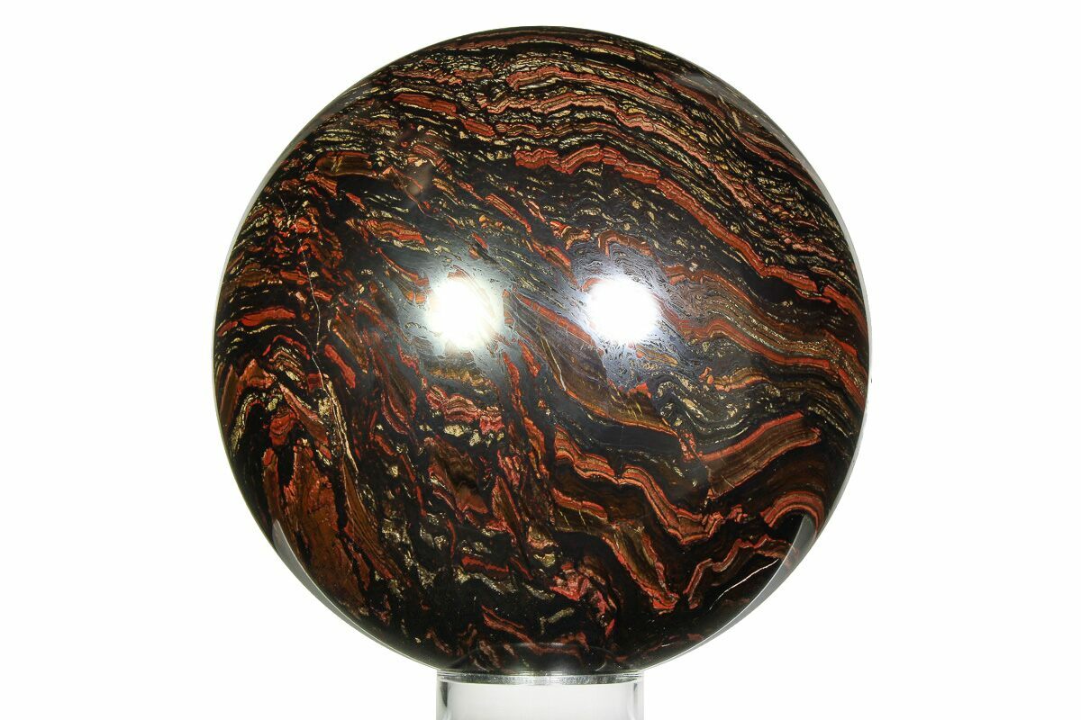 This exceptional 7.3" wide polished sphere is crafted from 3.02-billion-year-old Tiger Iron, sourced from the Ord Ranges of Western Australia. Showcasing vibrant bands of hematite, jasper, and golden tiger’s eye, it exhibits striking color contrast and chatoyancy when viewed in the light. A truly impressive display piece, it comes complete with an acrylic display stand for elegant presentation in any collection.