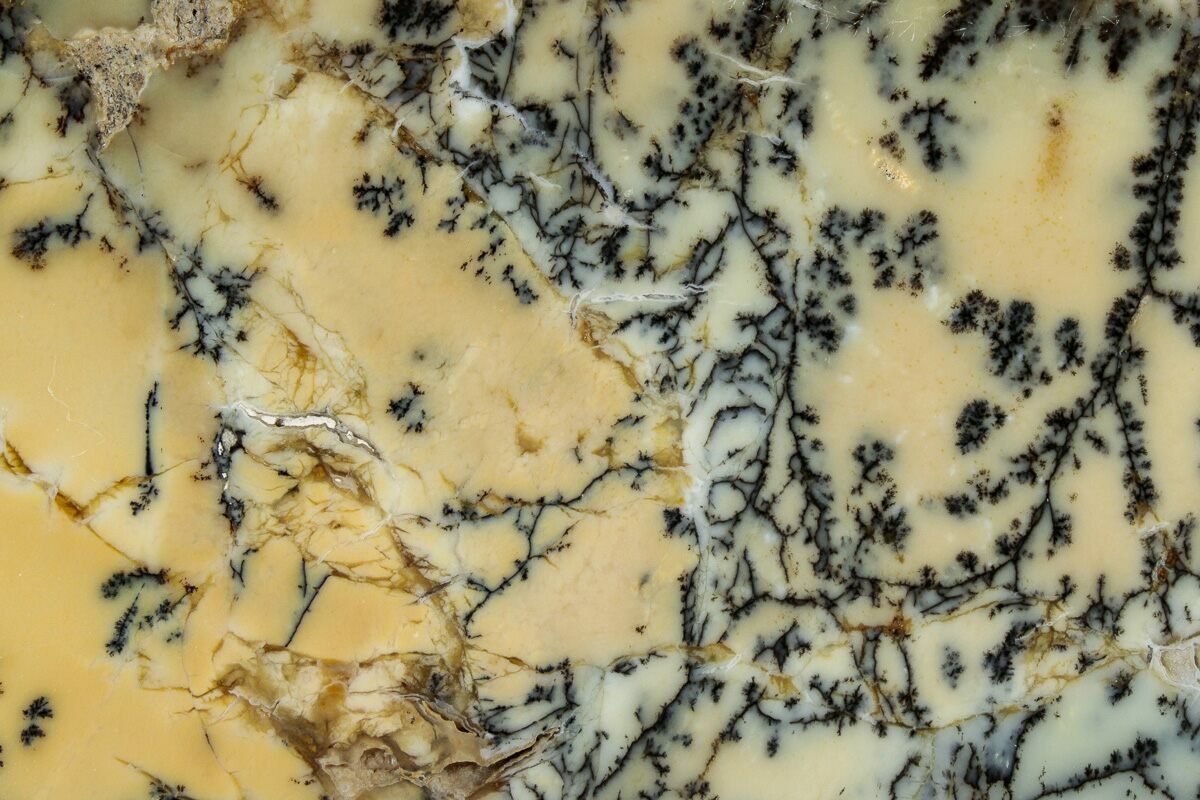 This is a beautiful section of "moss opal" containing small, black dendritic inclusions. It earns its more common name, "dendritic opal" from these small black inclusions. This form of opal comes from the Eastern Goldfields of Western Australia. It's known to occur near the towns of Kalgoorlie, Leonora, and Norseman.