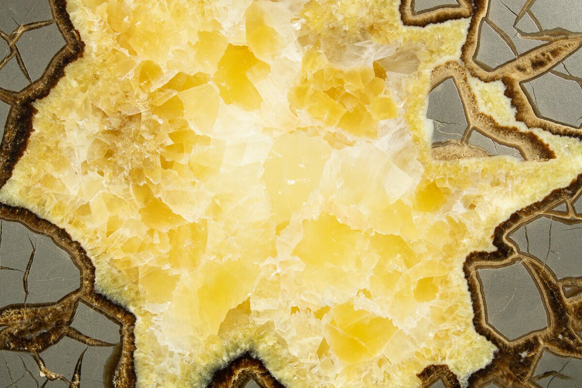 This is a beautiful polished slice from a septarian nodule. This septarian was mined West of Orderville, Utah and was deposited during the Late Cretaceous, about 100 million years ago. The contrast between the grey limestone, yellow calcite crystals, and brown aragonite is quite stunning. It has been polished on one side and displays well on the included display stand.