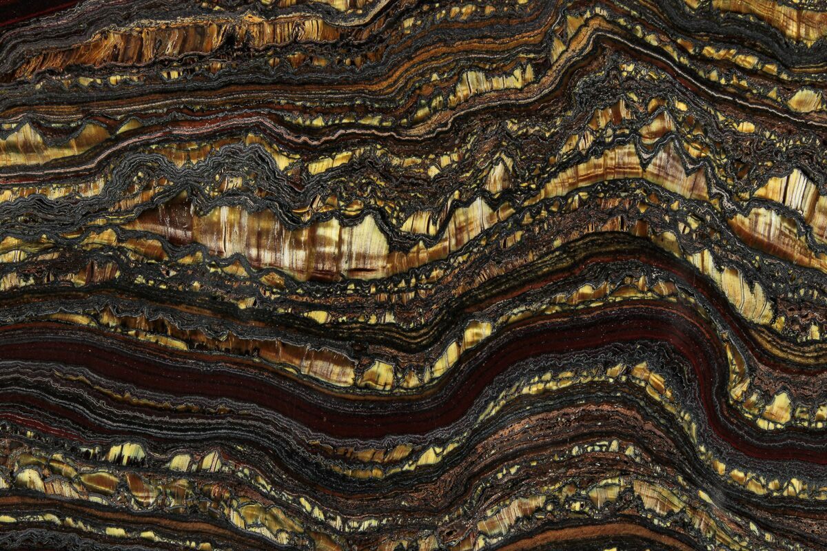 Many believe tiger iron should technically be considered a stromatolite formed by ancient cyanobacteria over two billion years ago. One theory holds that tiger iron is a typical stromatolite that has undergone mineral replacement with iron oxide. Another theory suggests that microbes formed the banded iron directly while the stromatolite was being formed.