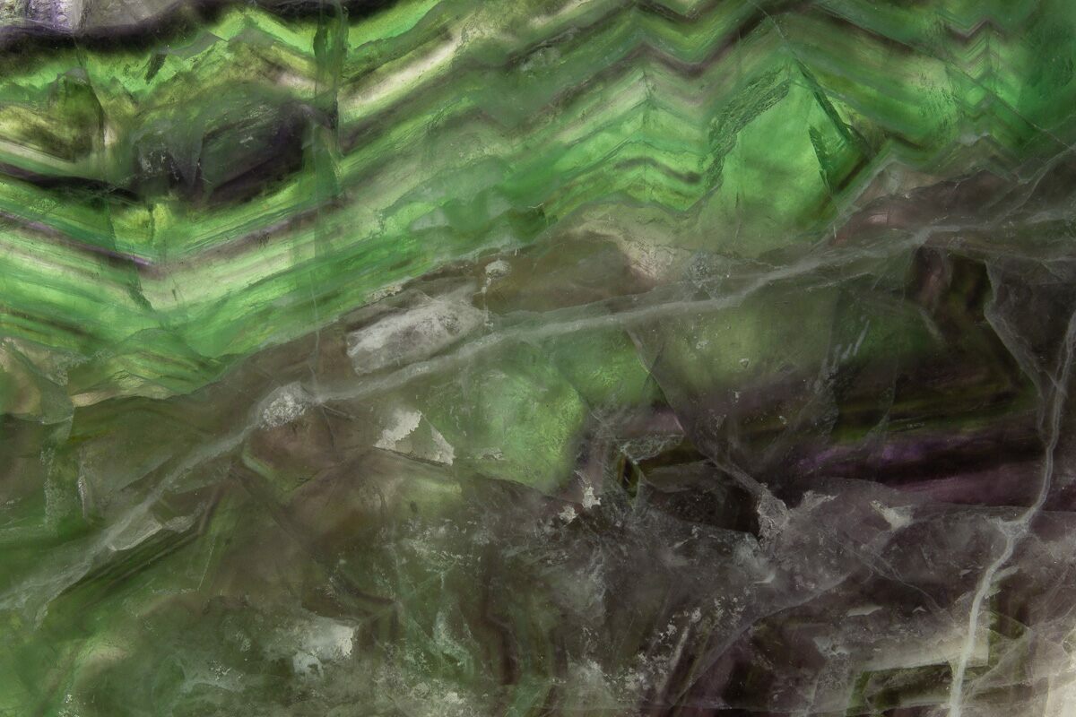 This is a beautiful slab of polished green and purple fluorite mined in China. Both sides have been polished to a glossy finish, really showing off its interior chevron patterns. The specimen has been backlit in the photos to better show the colors.