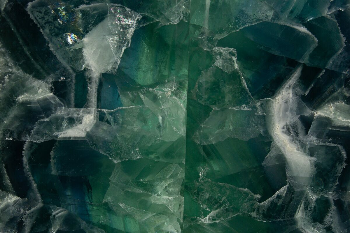 This is a pair of polished bookends made out of blue and green fluorite, mined in Mexico. They have been polished to a glossy finish on one side and under shortwave UV, the fluorite fluoresces purple. The larger bookend measures 7.4" by 4.7" by 1.9", and the smaller measures 7.1" by 4.3" by 1.8".