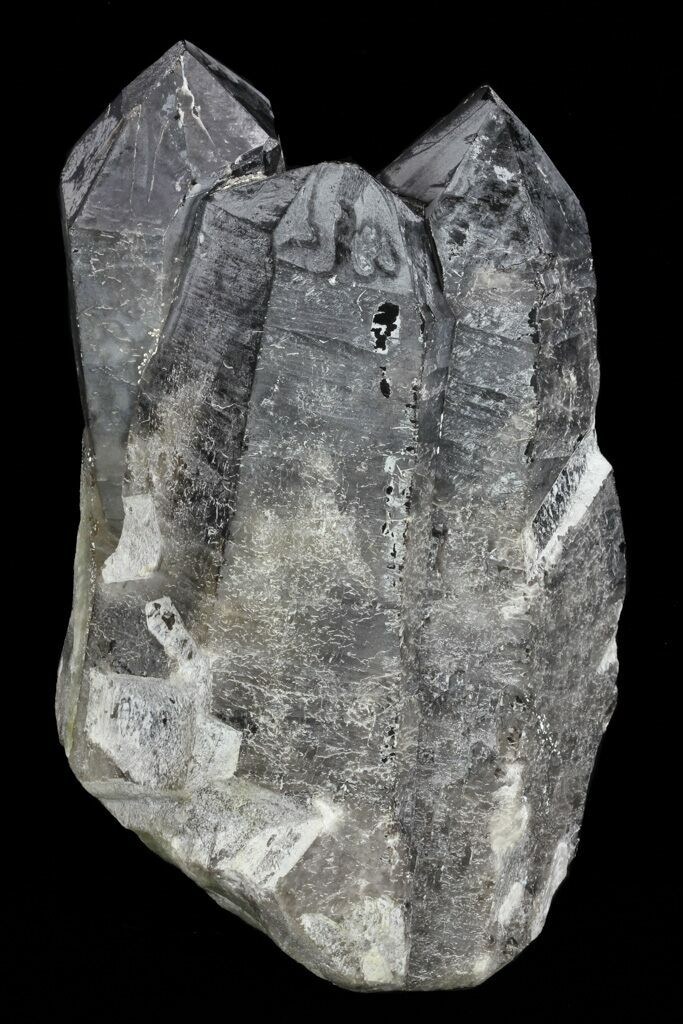 This is a cluster of large smoky quartz crystals from Brazil. The entire cluster is 7.4 inches tall and the longest point is 7.4 inches long. These massive crystals are relatively damage free and have beautiful smokey coloration. It has not been heated or treated to change the natural color.