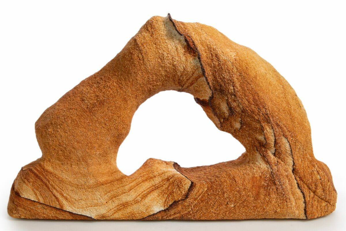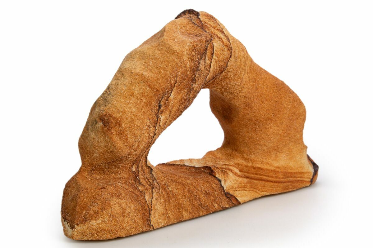 This is a 7.4" wide Toroweap picture sandstone arch. This stunning and distinctive sandstone, mined near Snowflake, Arizona, has been artistically crafted into an arch shape, inspired by natural sandstone formations like Delicate Arch in Arches National Park. The base of this specimen has been cut flat for vertical presentation.