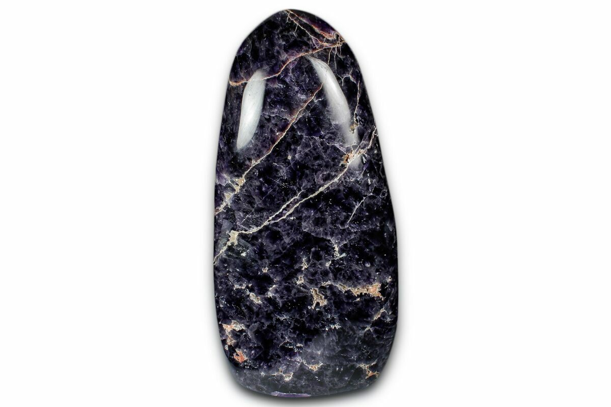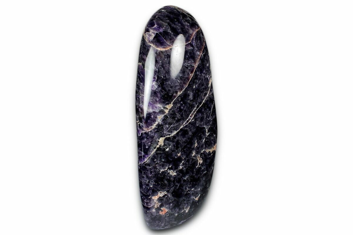 This is a beautiful, 7.4" tall, free-standing sculpture made from a deep-purple amethyst formation known as chevron amethyst. The bottom of the specimen has been cut flat so that it stands nicely on its own. This specimen was collected, cut, and polished in Madagascar.