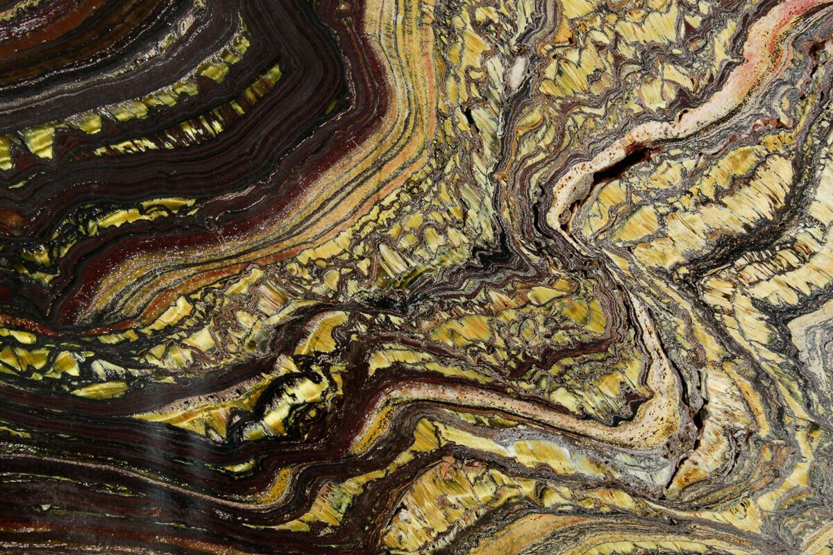 Many believe tiger iron should technically be considered a stromatolite formed by ancient cyanobacteria over two billion years ago. One theory holds that tiger iron is a typical stromatolite that has undergone mineral replacement with iron oxide. Another theory suggests that microbes formed the banded iron directly while the stromatolite was being formed.