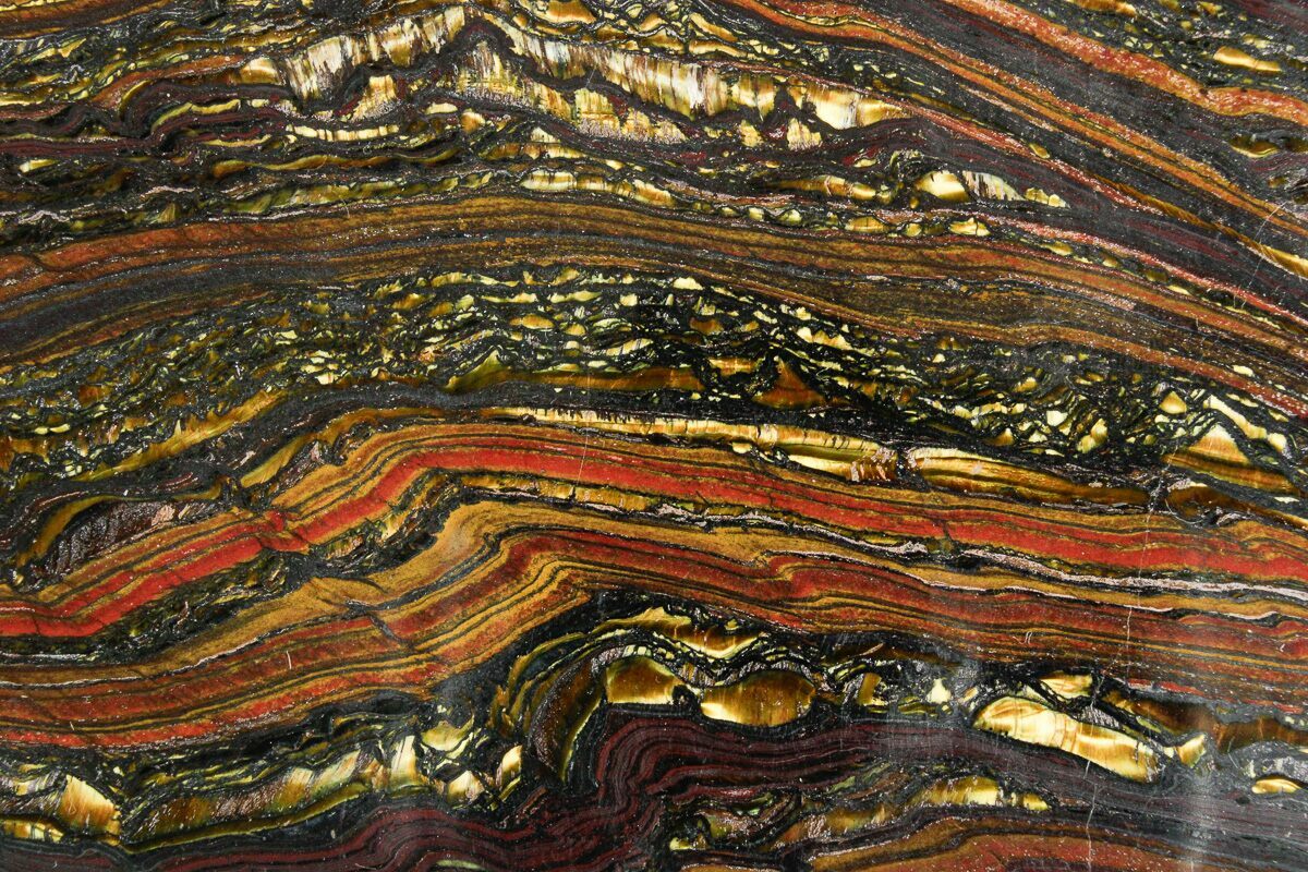 Tiger Iron is composed mainly of tiger's eye, red jasper, and black hematite in an undulating banded pattern. It is mined primarily in two large deposits, one in South Africa and the other in Western Australia. Both deposits are over 2 billion years old!
