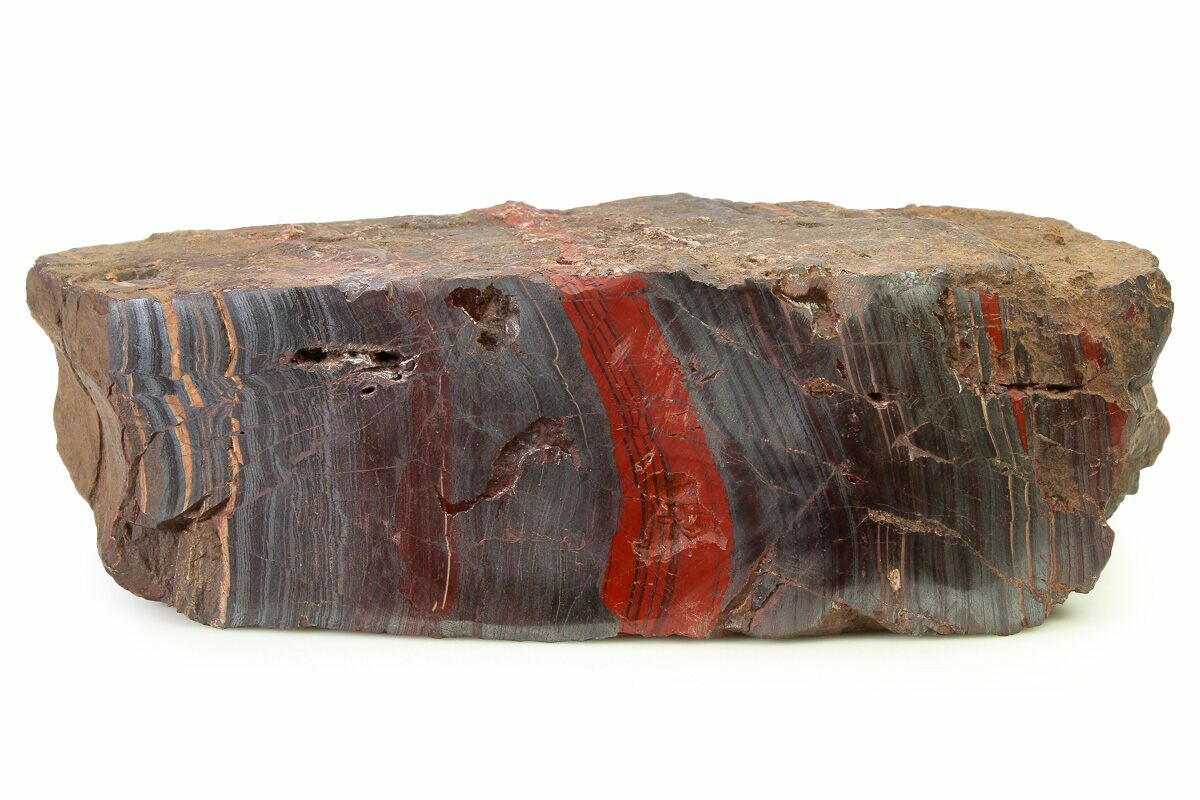 This is a beautiful, 7.6" wide section of a 2.5 billion year old banded iron formation, collected from Mingus Mountain near Jerome, Arizona. One sides has been polished while the rest of the specimen has been left in its natural state.