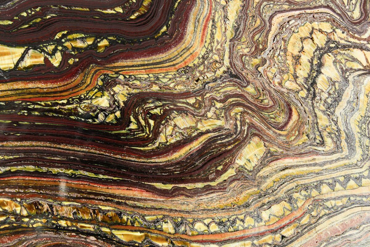 Tiger Iron is composed mainly of tiger's eye, red jasper, and black hematite in an undulating banded pattern. It is mined primarily in two large deposits, one in South Africa and the other in Western Australia. Both deposits are over 2 billion years old!