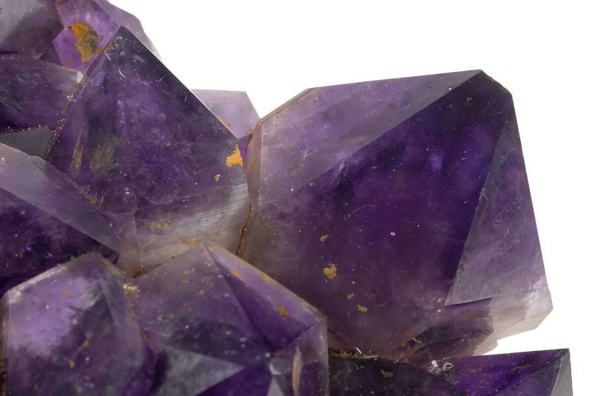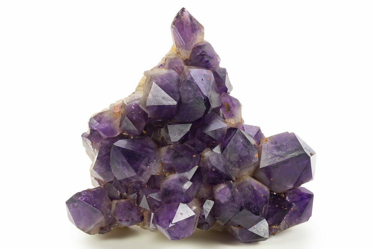 This is a stunning, 7.7" wide amethyst crystal cluster with beautiful purple coloration and exceptional luster, collected from the Democratic Republic of the Congo. These crystals have undergone no color treatment or polishing. The orange-red color across some of the crystals can be attributed to iron oxidation. This cluster contains one amazing, larger than average crystal amongst the medium-sized group. There is glue stabilization at the base of the crystals.
