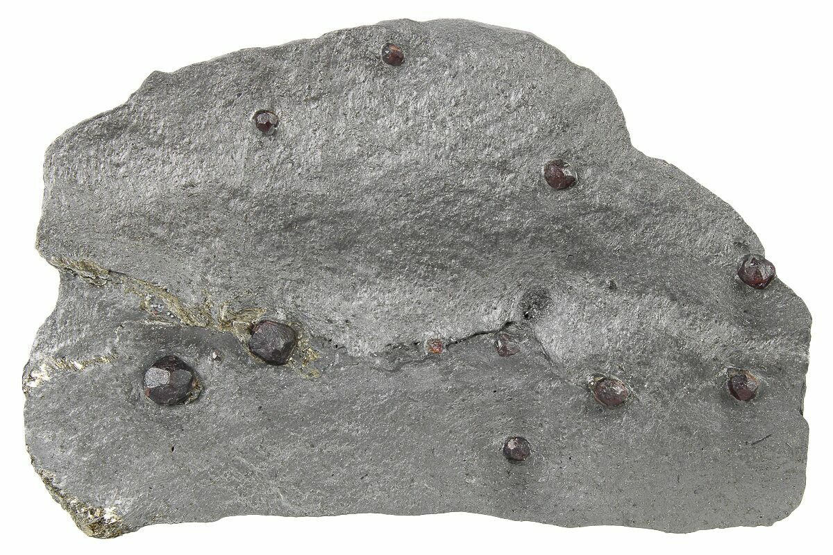 These are ten almandine garnets that are in a 7.7" wide graphite matrix from the Red Embers Mine near Erving, Massachusetts. The graphite matrix has been worked to expose all of the garnets from both sides of the rock. This type of prep allows the garnets to glow a fiery red when placing a light source behind the specimen.