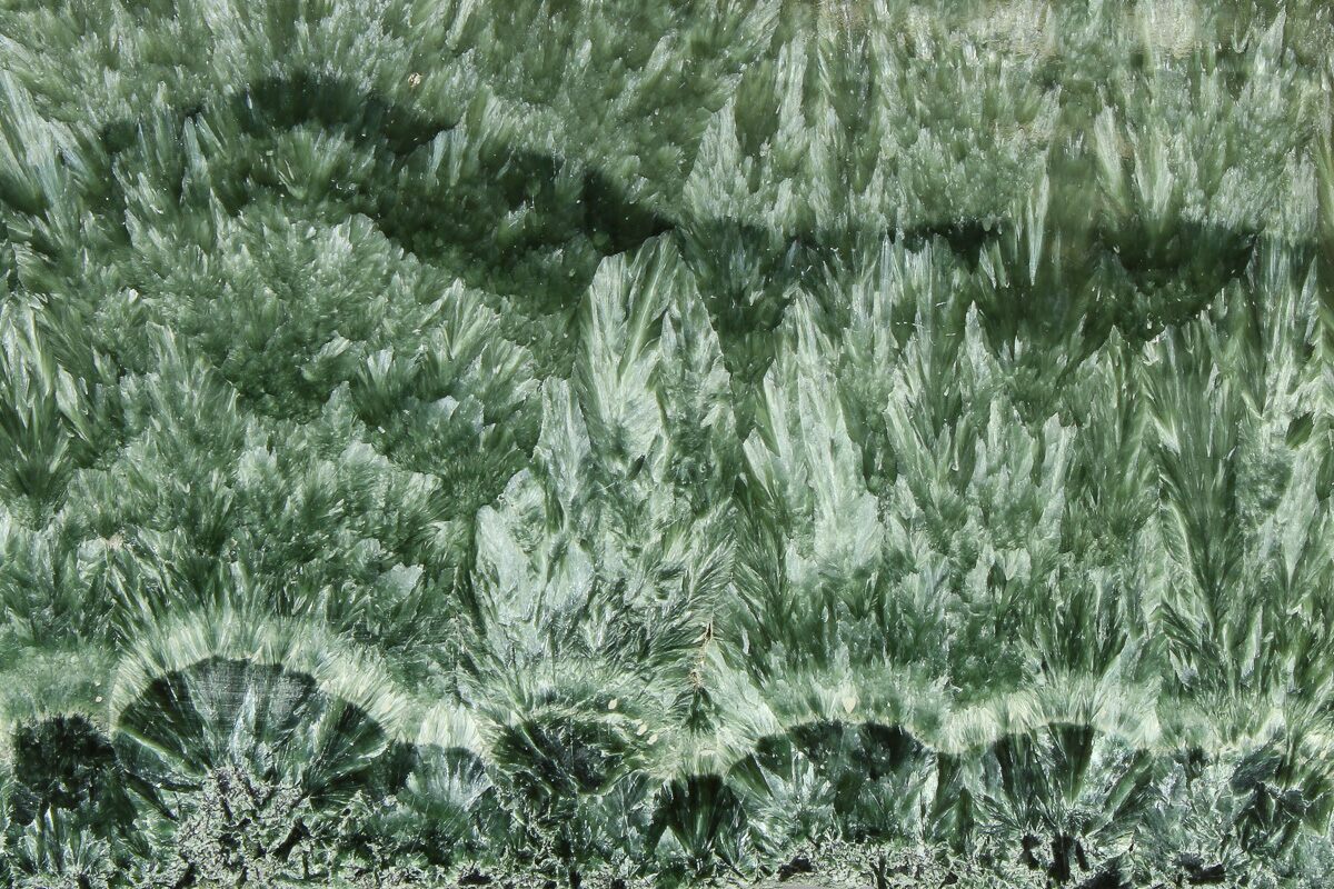 This is a cross-sectional cut slab of spherical seraphinite aggregations, collected from the Korshunovkiy mine (Korshunovskoye Iron Skarn) in Siberia, Russia. It has been polished to a glossy finish, revealing the chatoyant nature of this stunning mineral.