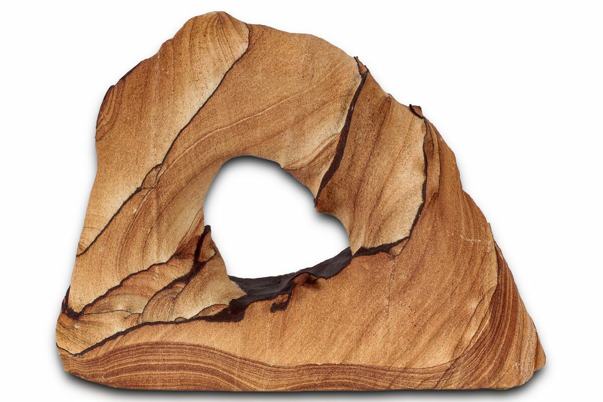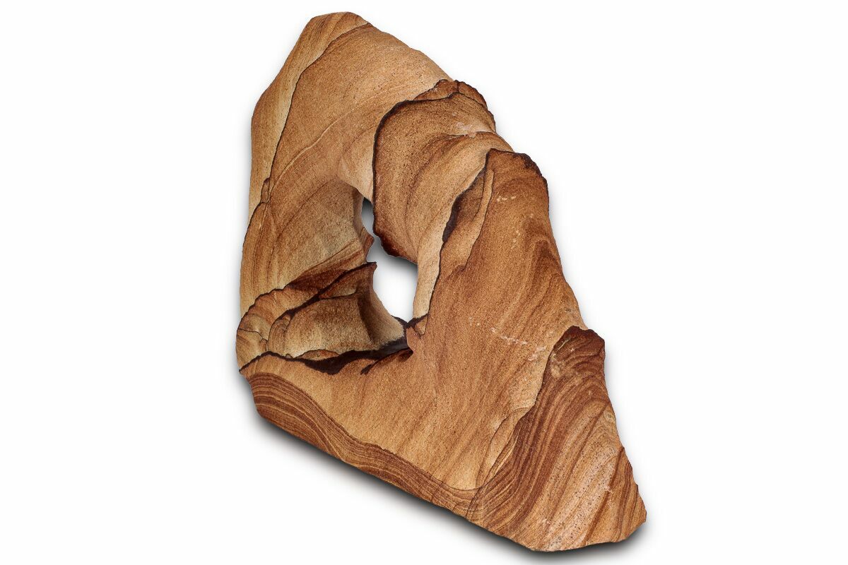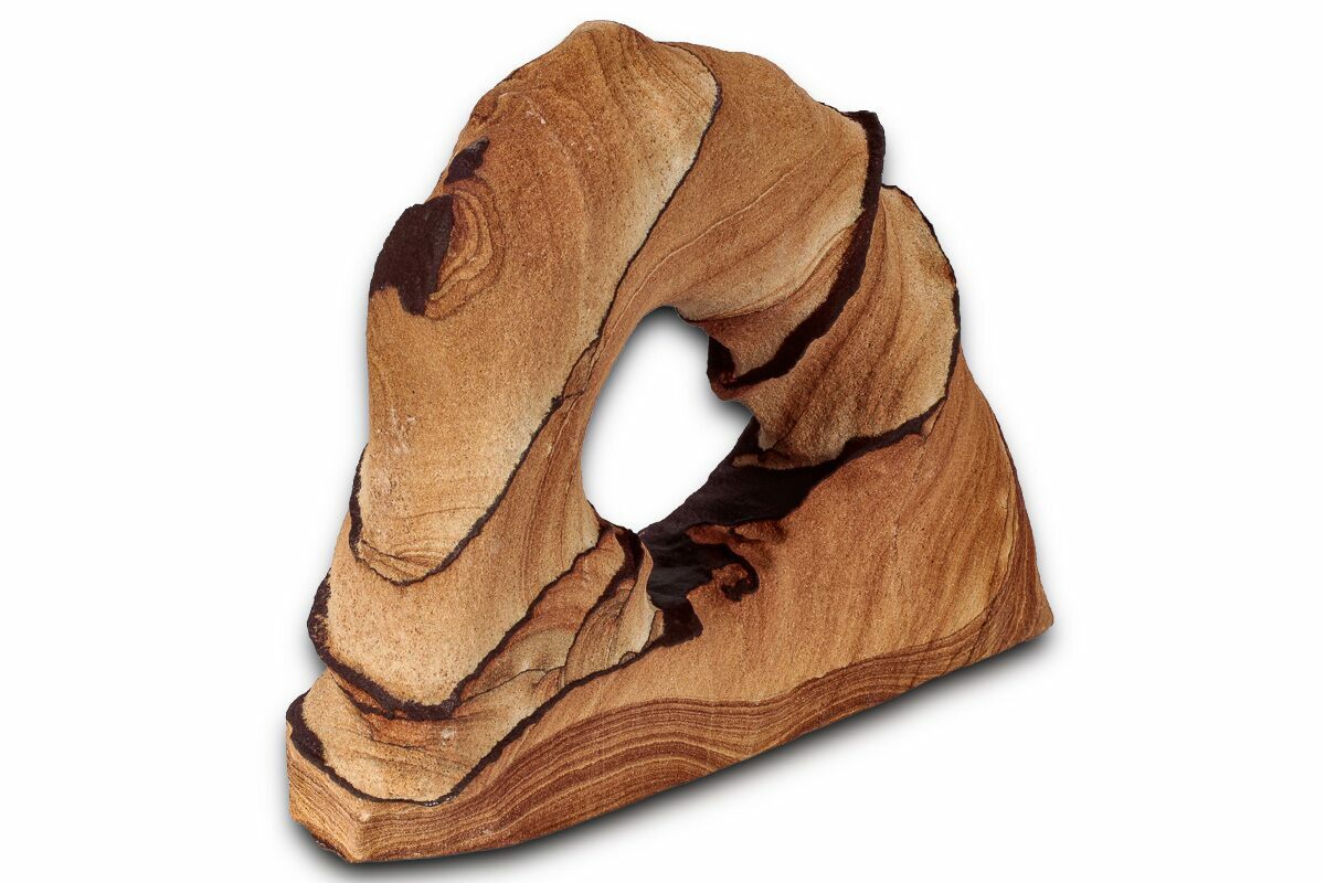 This is a 7.7" wide Toroweap picture sandstone arch. This stunning and distinctive sandstone, mined near Snowflake, Arizona, has been artistically crafted into an arch shape, inspired by natural sandstone formations like Delicate Arch in Arches National Park. The base of this specimen has been cut flat easy display.
