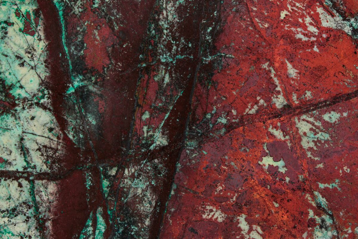 Sonora sunset (also known as Sonora sunrise) is the trade name for a blue, green, black, and red mineral formation collected from the Milpillas Mine in Sonora, Mexico, a copper ore mine. While this mine is known for its high quality azurite, chalcocite, chrysocolla, cuprite, malachite, and pyrite mineral specimens, it also produces this gorgeous material, which miners would come across occasionally during mining. It is a combination of blue-green chrysocolla, vibrant red cuprite, and streaks of black attributed to iron oxidation. The material is usually cut in a specific orientation, using the black to separate the blue-green and red, creating the appearance of a green landscape with a red sunset/sunrise sky.