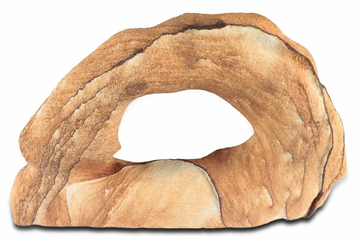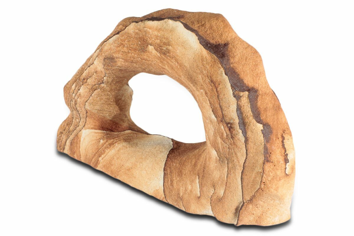 This is a 7.75" wide Toroweap picture sandstone arch. This stunning and distinctive sandstone, mined near Snowflake, Arizona, has been artistically crafted into an arch shape, inspired by natural sandstone formations like Delicate Arch in Arches National Park. The base of this specimen has been cut flat for vertical presentation.