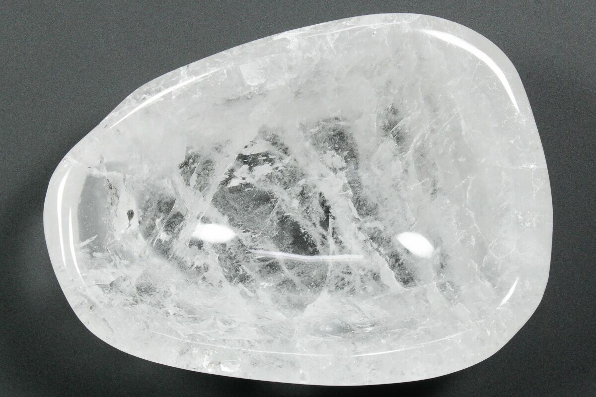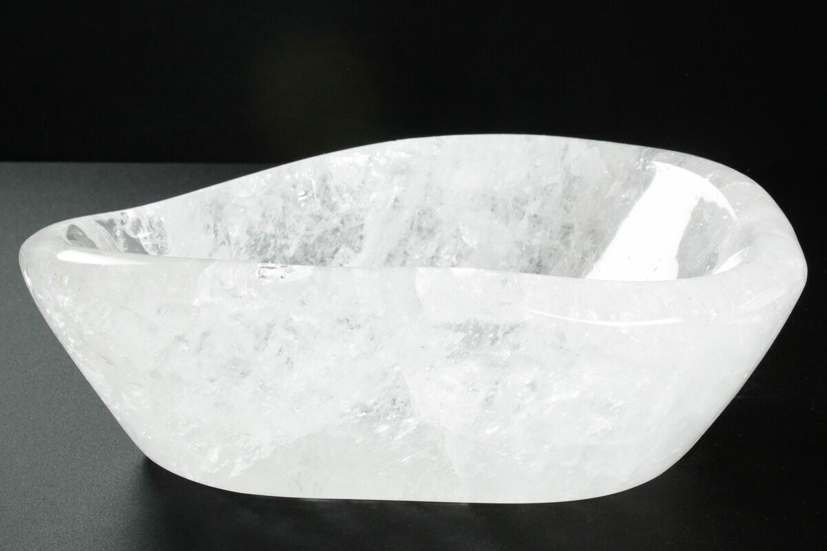 This is a 7.8" wide polished quartz bowl from Madagascar. The specimen has been shaped into a dish after being cut from a bigger chunk of quartz. This specimen makes an excellent display and serves many practical purposes.