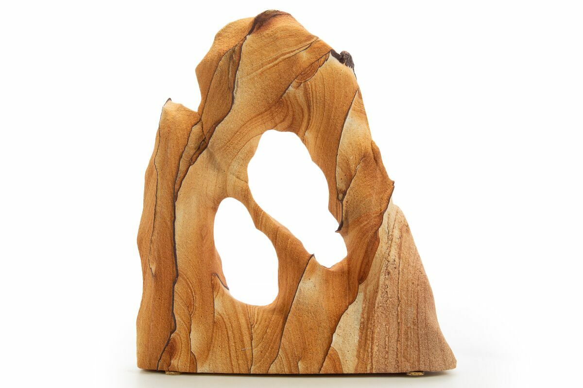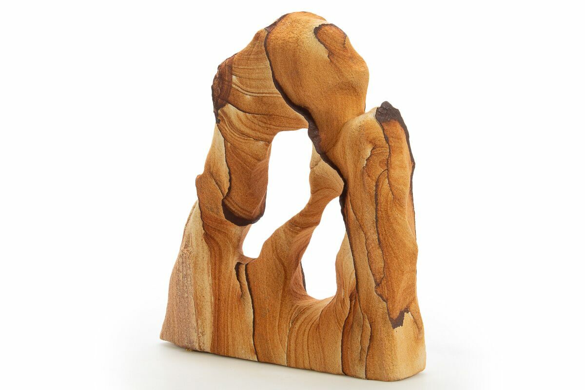 This is a 7.8" tall Toroweap picture sandstone arch. This stunning and distinctive sandstone, mined near Snowflake, Arizona, has been artistically crafted into an arch shape, inspired by natural sandstone formations like Delicate Arch in Arches National Park. The base of this specimen has been cut flat for vertical presentation.