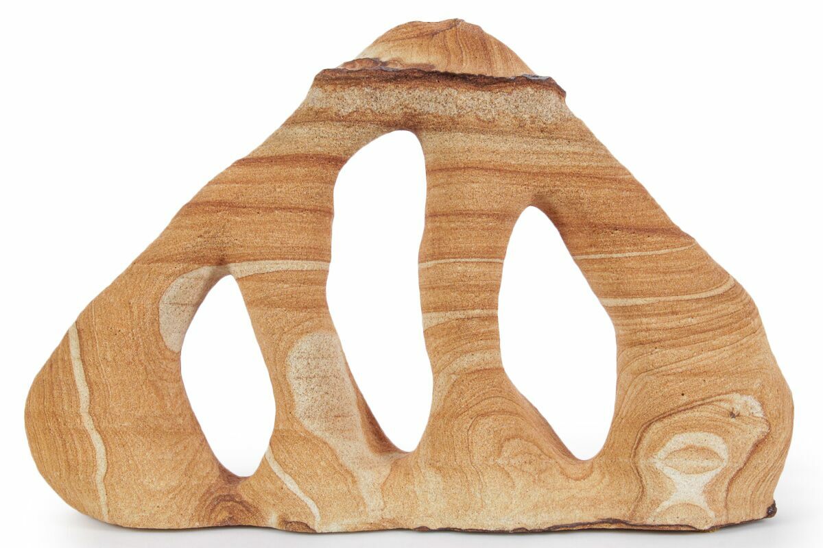 This is a 7.85" wide Toroweap picture sandstone arch. This stunning and distinctive sandstone, mined near Snowflake, Arizona, has been artistically crafted into an arch shape, inspired by natural sandstone formations like Delicate Arch in Arches National Park. The base of this specimen has been cut flat for vertical presentation.