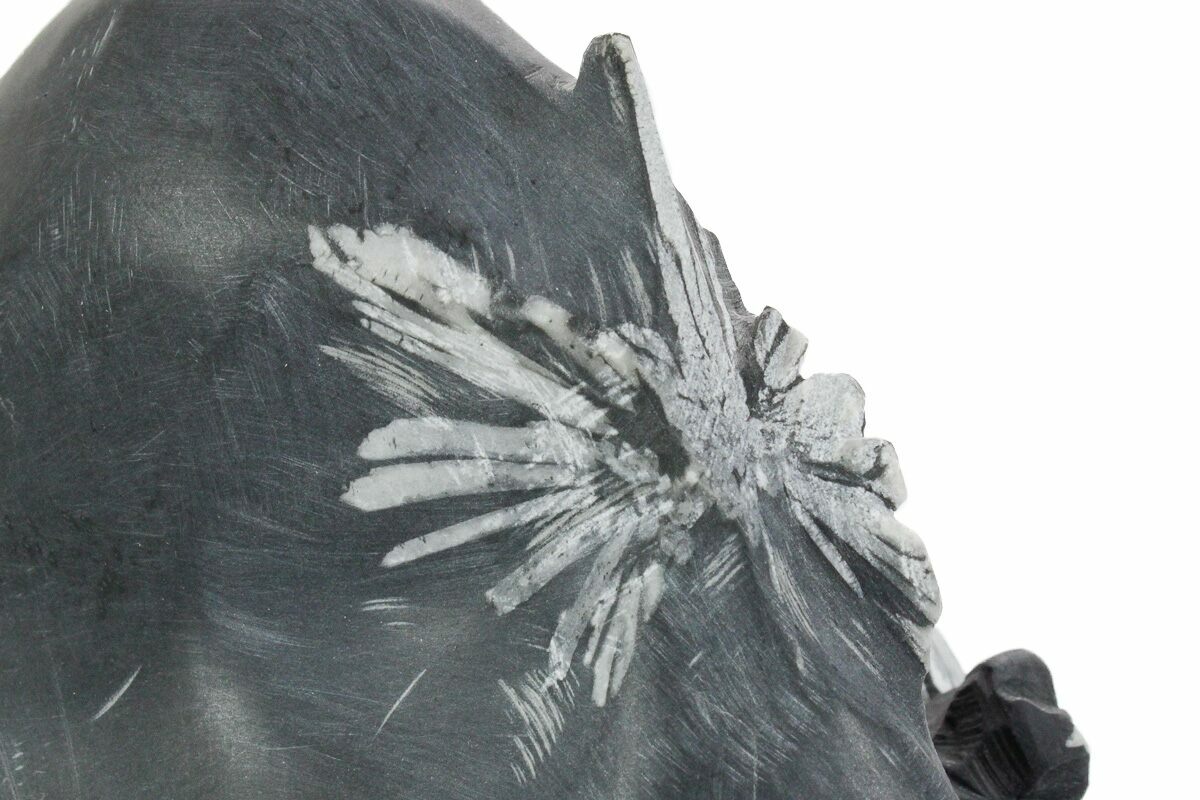 Chrysanthemum stone is the name given to a unique geological formation that resembles stark white flower petals on a dark sedimentary matrix. These unique stones started as accumulations of sediment deposited on the floors of ancient water bodies. As layers of sediment built up over these depositions, they cracked and were subsequently percolated by fluids rich in calcite, dolomite, and even andalusite or celestine. As these crystals grew or replaced previous crystals and the matrix continued to fracture under tectonic pressures, they produced the striking petal-like patterns seen in these formation.