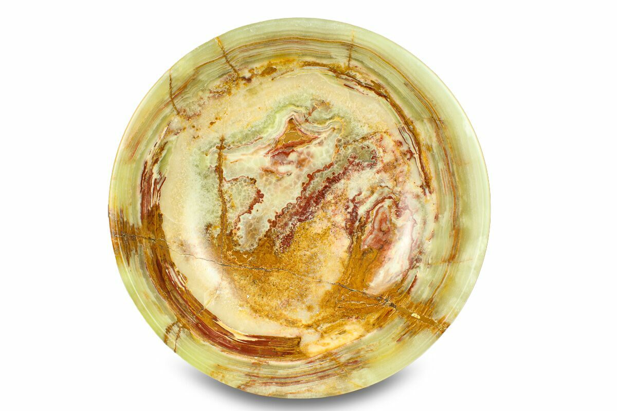This is a beautiful polished bowl carved from a kind of calcite often (incorrectly) marketed as Pakistan green onyx. The stone varies from pale to deep olive green and has white and red banding throughout. It measures 7.9" in diameter.