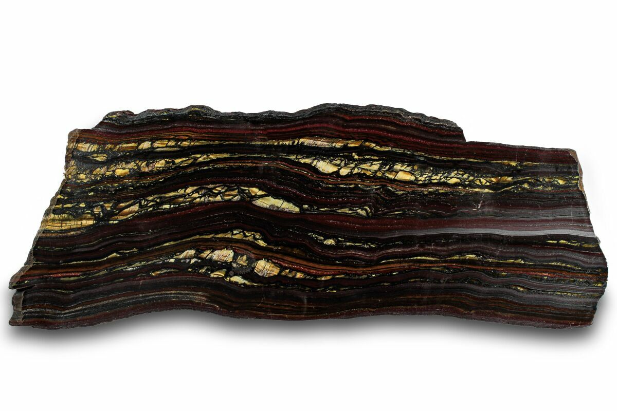 Tiger Iron is composed mainly of tiger's eye, red jasper, and black hematite in an undulating banded pattern. It is mined primarily in two large deposits, one in South Africa and the other in Western Australia. Both deposits are over 2 billion years old!