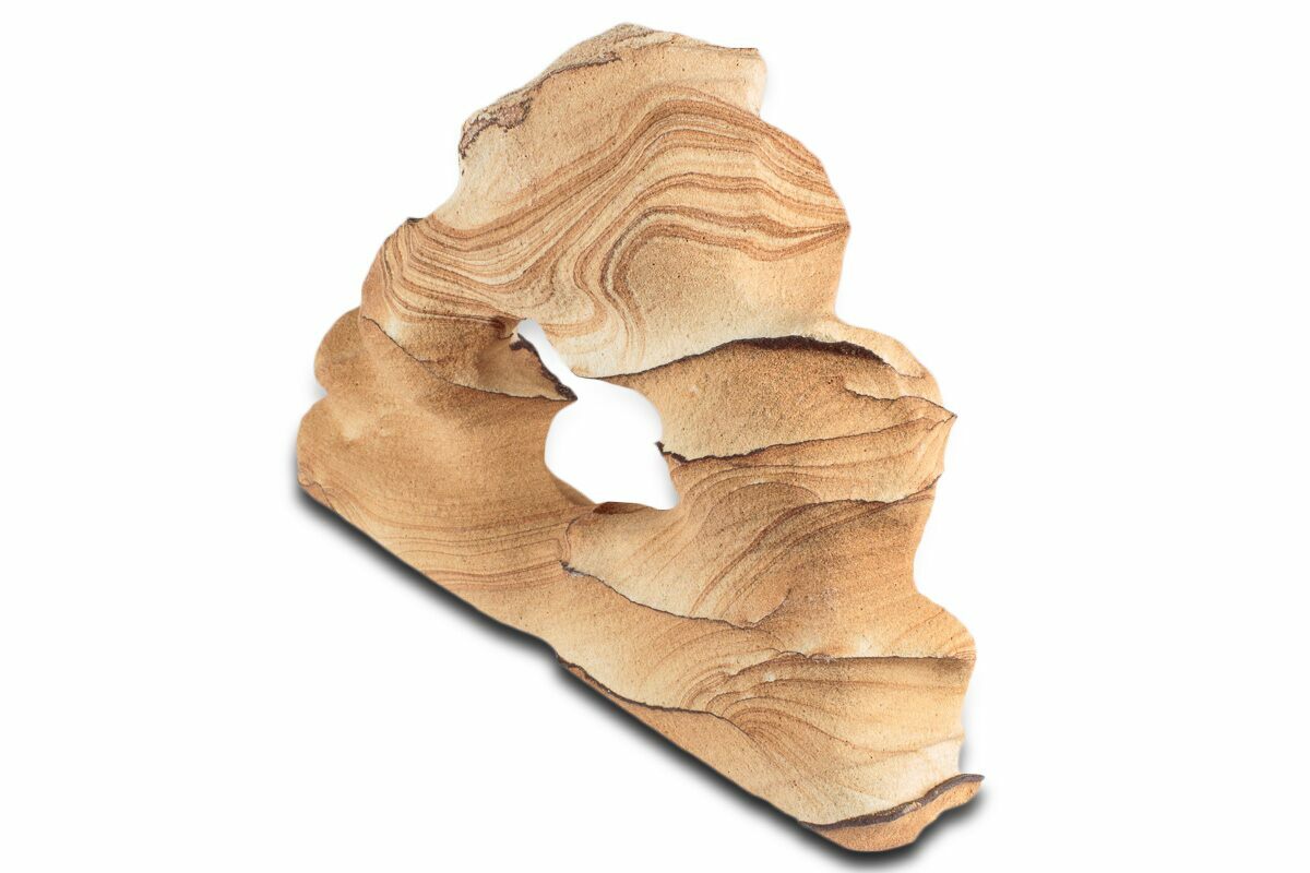 This is a 7.95" wide Toroweap picture sandstone arch. This stunning and distinctive sandstone, mined near Snowflake, Arizona, has been artistically crafted into an arch shape, inspired by natural sandstone formations like Delicate Arch in Arches National Park. The base of this specimen has been cut flat for vertical presentation.
