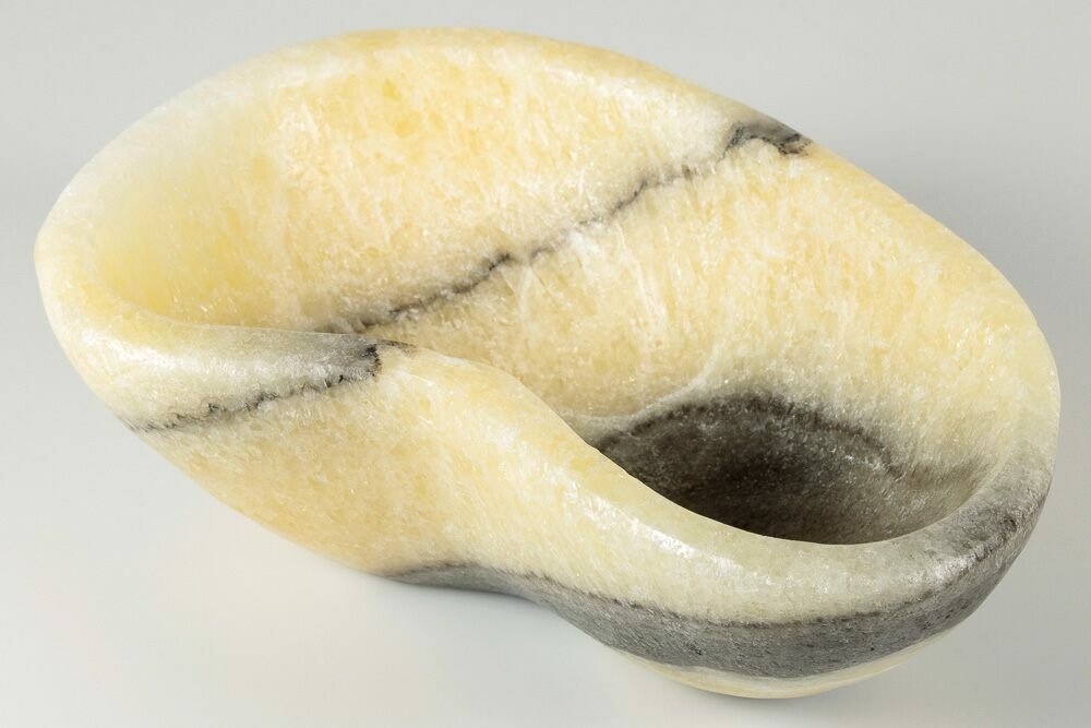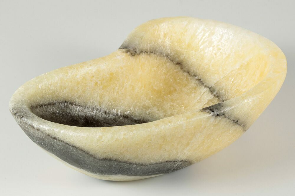 This is a 7" wide banded zebra calcite dish. Zebra calcite may also be referred to as Raw Phantom Calcite, but both names point to the same mineral. This specimen features a field of golden calcite/aragonite interlaced with black and brown banding. It makes an excellent display piece and a great vessel for other items. The texture of these dishes is quite unique and enjoyable in the hands.